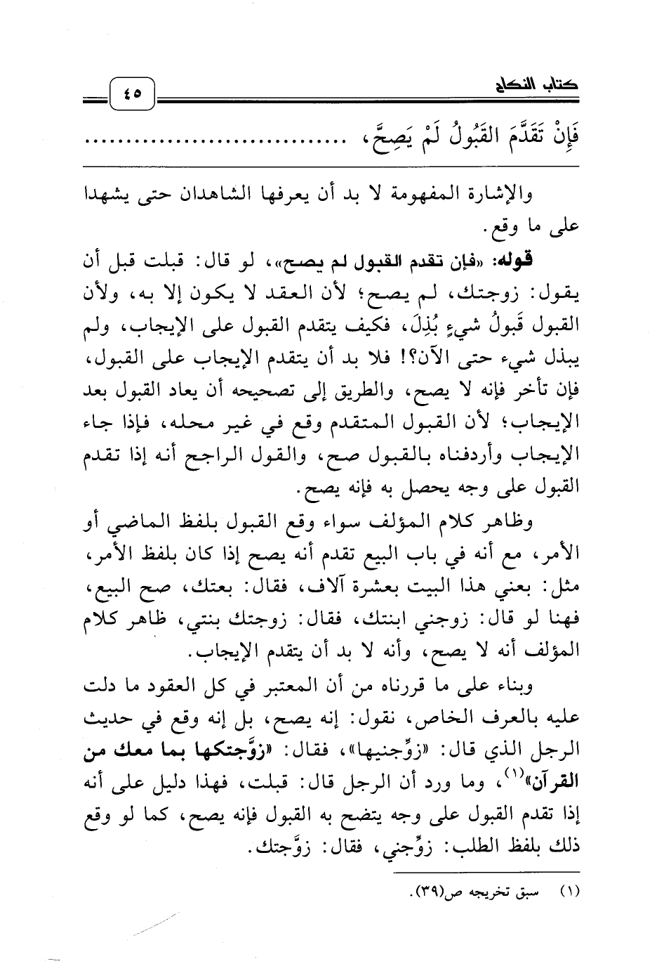 قوله: «فإن تقدم القبول لم يصح»، لو قال: قبلت قبل أن يقول: زوجتك، لم يصح؛ لأن العقد لا يكون إلا به، ولأن القبول قَبولُ شيءٍ بُذِلَ، فكيف يتقدم القبول على الإيجاب، ولم يبذل شيء حتى الآن؟! فلا بد أن يتقدم الإيجاب على القبول، فإن تأخر فإنه لا يصح، والطريق إلى تصحيحه أن يعاد القبول بعد الإيجاب؛ لأن القبول المتقدم وقع في غير محله، فإذا جاء الإيجاب وأردفناه بالقبول صح، والقول الراجح أنه إذا تقدم القبول على وجه يحصل به فإنه يصح.