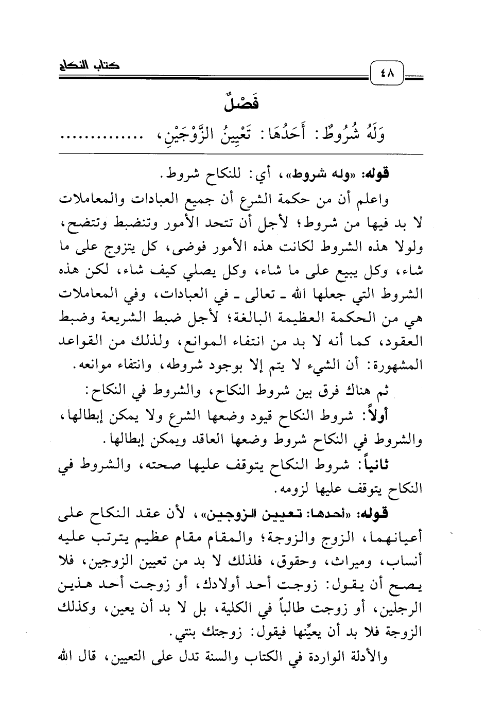 قوله: «أحدها: تعيين الزوجين»، لأن عقد النكاح على أعيانهما، الزوج والزوجة؛ والمقام مقام عظيم يترتب عليه أنساب، وميراث، وحقوق، فلذلك لا بد من تعيين الزوجين، فلا يصح أن يقول: زوجت أحد أولادك، أو زوجت أحد هذين الرجلين، أو زوجت طالباً في الكلية، بل لا بد أن يعين، وكذلك الزوجة فلا بد أن يعيِّنها فيقول: زوجتك بنتي.
