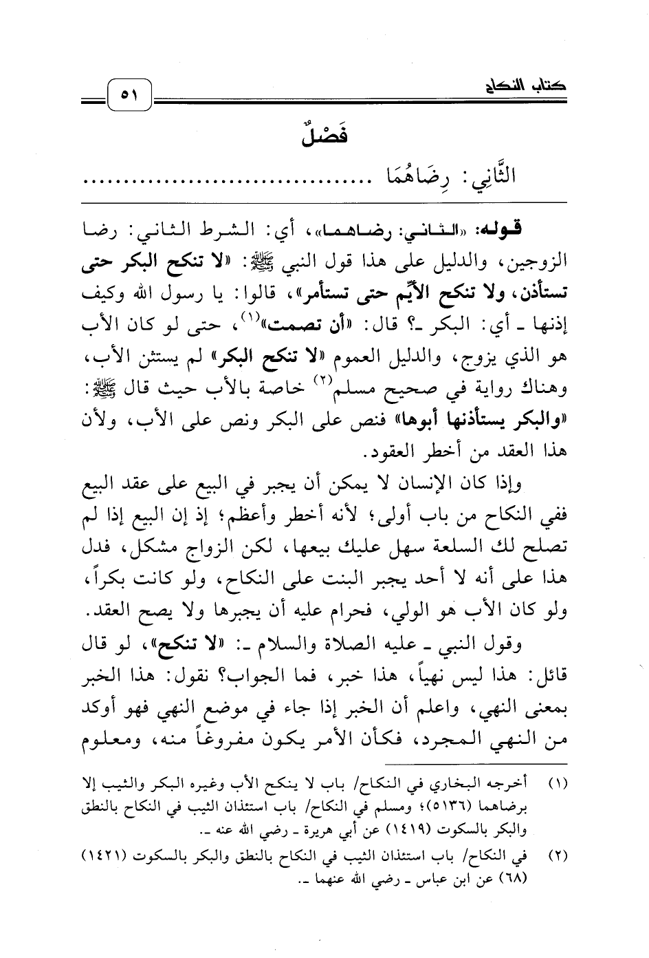 قوله: «الثاني: رضاهما»، أي: الشرط الثاني: رضا الزوجين، والدليل على هذا قول النبي صلّى الله عليه وسلّم: «لا تنكح البكر حتى تستأذن، ولا تنكح الأيِّم حتى تستأمر»، قالوا: يا رسول الله وكيف إذنها ـ أي: البكر ـ؟ قال: «أن تصمت» (¬1)، حتى لو كان الأب هو الذي يزوج، والدليل العموم «لا تنكح البكر» لم يستثن الأب، وهناك رواية في صحيح مسلم (¬2) خاصة بالأب حيث قال صلّى الله عليه وسلّم: «والبكر يستأذنها أبوها» فنص على البكر ونص على الأب، ولأن هذا العقد من أخطر العقود.