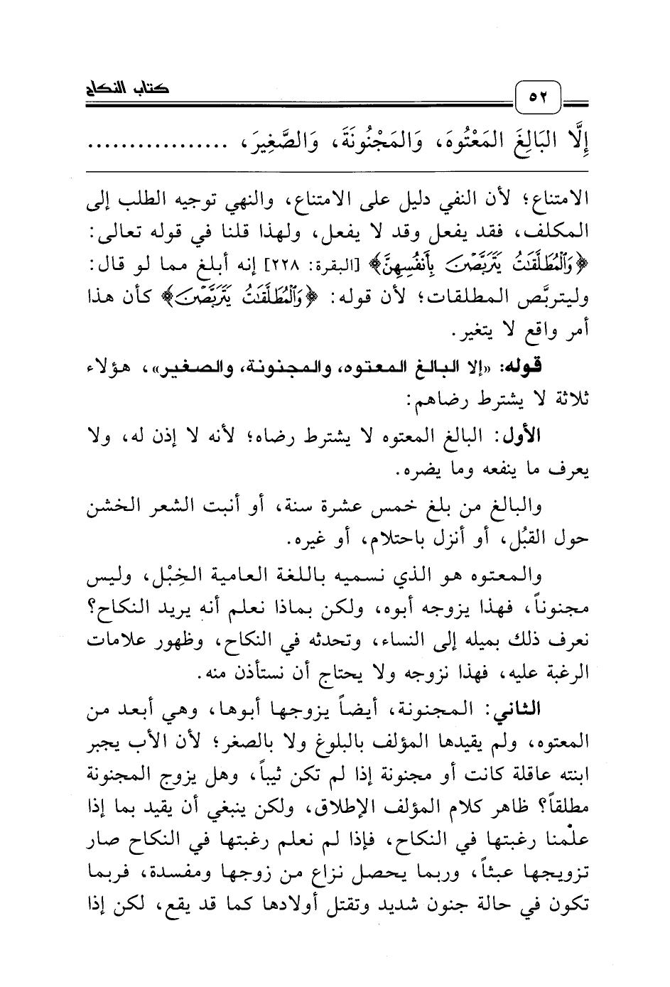 إِلاَّ البَالِغَ المَعْتُوهَ، وَالمَجْنُونَةَ، وَالصَّغِيرَ، وَالبِكْرَ وَلَوْ مُكَلَّفَةً، .......