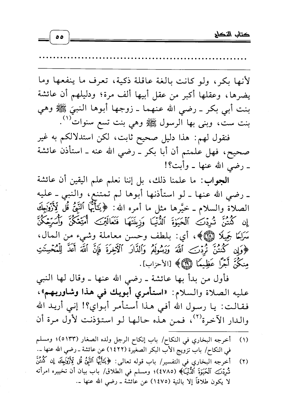 (¬1) أخرجه البخاري في النكاح/ باب إنكاح الرجل ولده الصغار (5133)؛ ومسلم في النكاح/ باب تزويج الأب البكر الصغيرة (1422) عن عائشة ـ رضي الله عنها ـ.