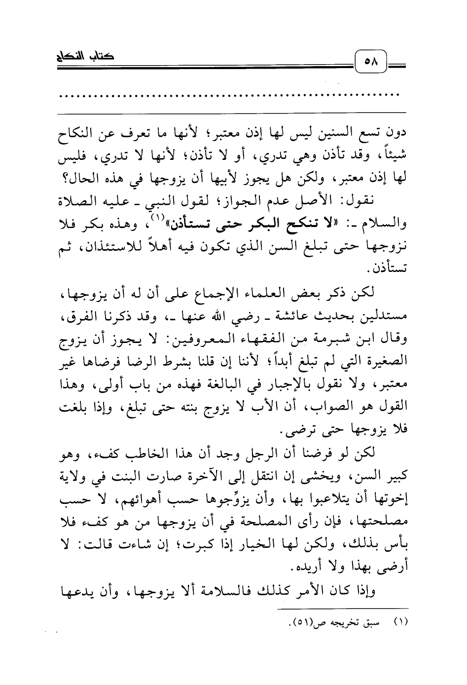 لكن ذكر بعض العلماء الإجماع على أن له أن يزوجها، مستدلين بحديث عائشة ـ رضي الله عنها ـ، وقد ذكرنا الفرق، وقال ابن شبرمة من الفقهاء المعروفين: لا يجوز أن يزوج الصغيرة التي لم تبلغ أبداً؛ لأننا إن قلنا بشرط الرضا فرضاها غير معتبر، ولا نقول بالإجبار في البالغة فهذه من باب أولى، وهذا القول هو الصواب، أن الأب لا يزوج بنته حتى تبلغ، وإذا بلغت فلا يزوجها حتى ترضى.