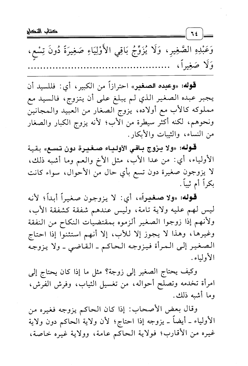 وَعَبْدِهِ الصَّغِيرِ، وَلاَ يُزَوِّجُ بَاقِي الأَوْلِيَاءِ صَغِيرَةً دُونَ تِسْعٍ، وَلاَ صَغِيراً، وَلاَ كَبِيرَةً عَاقِلَةً، وَلاَ بِنْتَ تِسْعٍ إِلاَّ بِإِذْنِهِمَا، وَهُوَ صُمَاتُ البِكْرِ، وَنُطْقُ الثَّيِّبِ،.