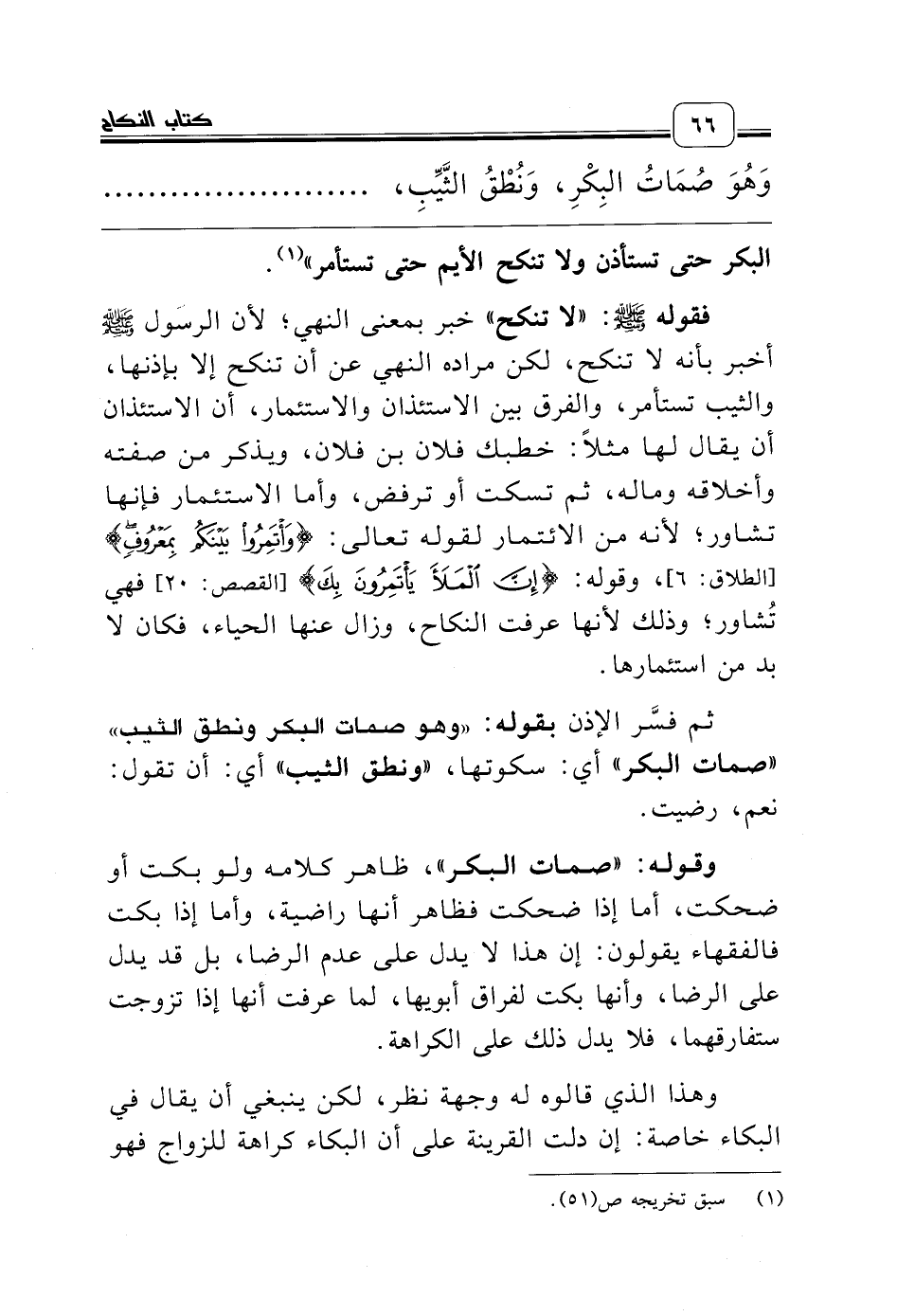 ثم فسَّر الإذن بقوله: «وهو صمات البكر ونطق الثيب» «صمات البكر» أي: سكوتها، «ونطق الثيب» أي: أن تقول: نعم، رضيت.