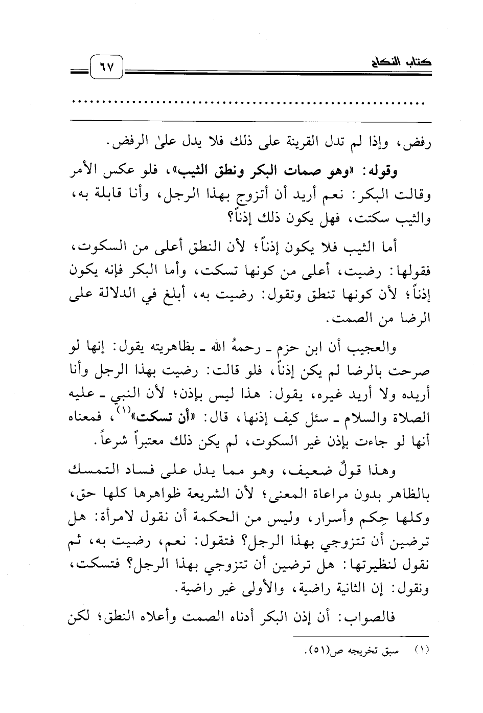 والعجيب أن ابن حزم ـ رحمه الله ـ بظاهريته يقول: إنها لو صرحت بالرضا لم يكن إذناً، فلو قالت: رضيت بهذا الرجل وأنا أريده ولا أريد غيره، يقول: هذا ليس بإذن؛ لأن النبي ـ عليه الصلاة والسلام ـ سئل كيف إذنها، قال: «أن تسكت» (¬1)، فمعناه أنها لو جاءت بإذن غير السكوت، لم يكن ذلك معتبراً شرعاً.