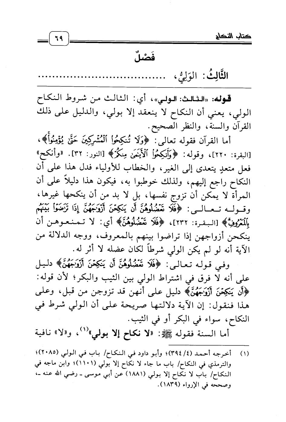 (¬1) أخرجه أحمد (4/ 394)؛ وأبو داود في النكاح/ باب في الولي (2085)؛ والترمذي في النكاح/ باب ما جاء لا نكاح إلا بولي (1101)؛ وابن ماجه في النكاح/ باب لا نكاح إلا بولي (1881) عن أبي موسى ـ رضي الله عنه ـ، وصححه في الإرواء (1839).