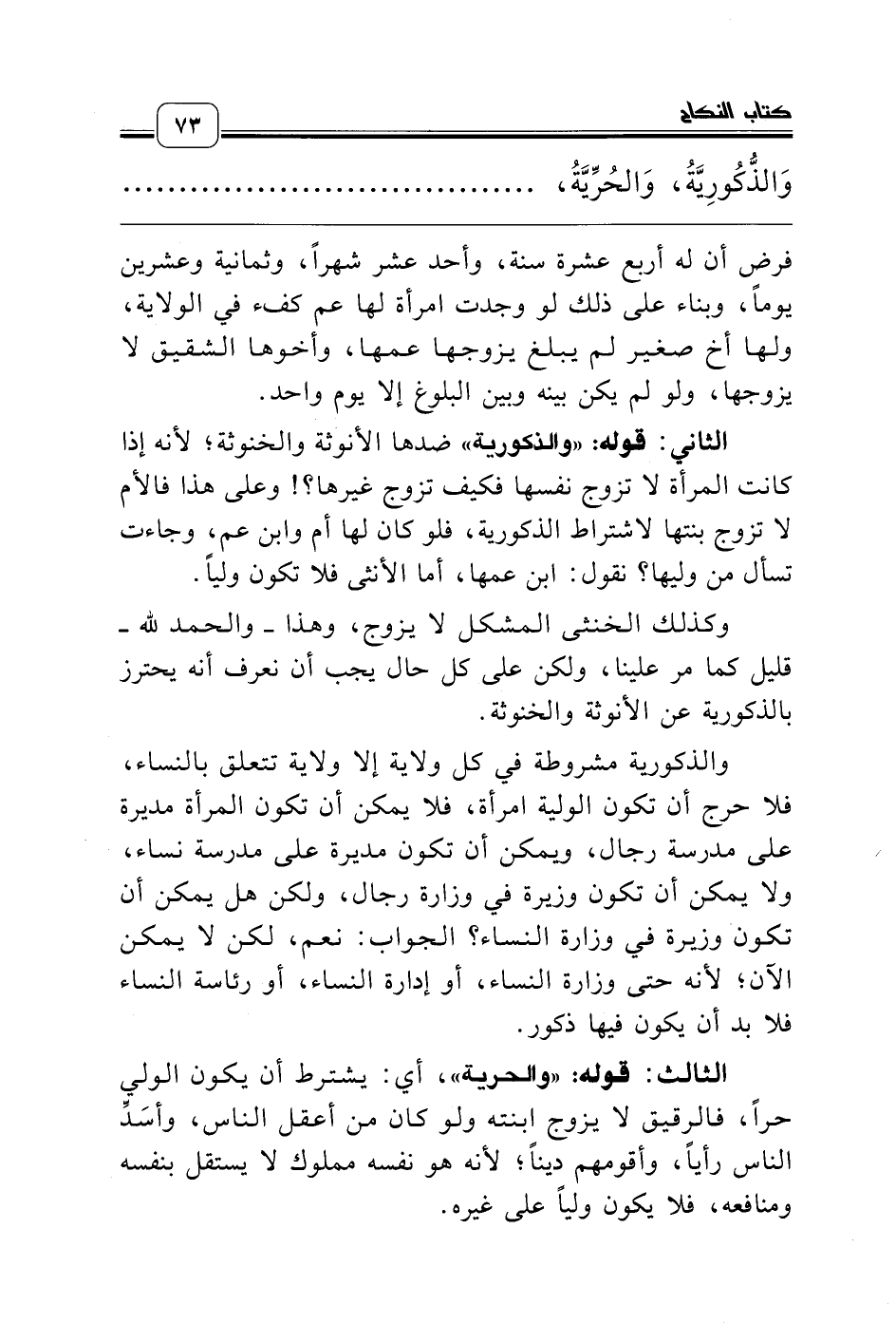 الثاني: قوله: «والذكورية» ضدها الأنوثة والخنوثة؛ لأنه إذا كانت المرأة لا تزوج نفسها فكيف تزوج غيرها؟! وعلى هذا فالأم لا تزوج بنتها لاشتراط الذكورية، فلو كان لها أم وابن عم، وجاءت تسأل من وليها؟ نقول: ابن عمها، أما الأنثى فلا تكون ولياً.