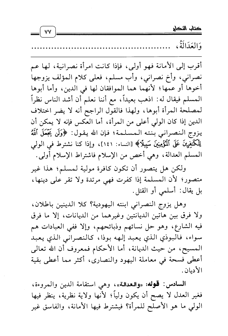 أقرب إلى الأمانة فهو أولى، فإذا كانت امرأة نصرانية، لها عم نصراني، وأخ نصراني، وأب مسلم، فعلى كلام المؤلف يزوجها أخوها أو عمها؛ لأنهما هما الموافقان لها في الدين، وأما أبوها المسلم فيقال له: اذهب بعيداً، مع أننا نعلم أن أشد الناس نظراً لمصلحة المرأة أبوها، ولهذا فالقول الراجح أنه لا يضر اختلاف الدين إذا كان الولي أعلى من المرأة، أما العكس فإنه لا يمكن أن يزوج النصراني بنته المسلمة؛ فإن الله يقول: {وَلَنْ يَجْعَلَ اللَّهُ لِلْكَافِرِينَ عَلَى الْمُؤْمِنِينَ سَبِيلاً} [النساء: 141]، وإذا كنا نشترط في الولي المسلم العدالة، وهي أخص من الإسلام فاشتراط الإسلام أولى.