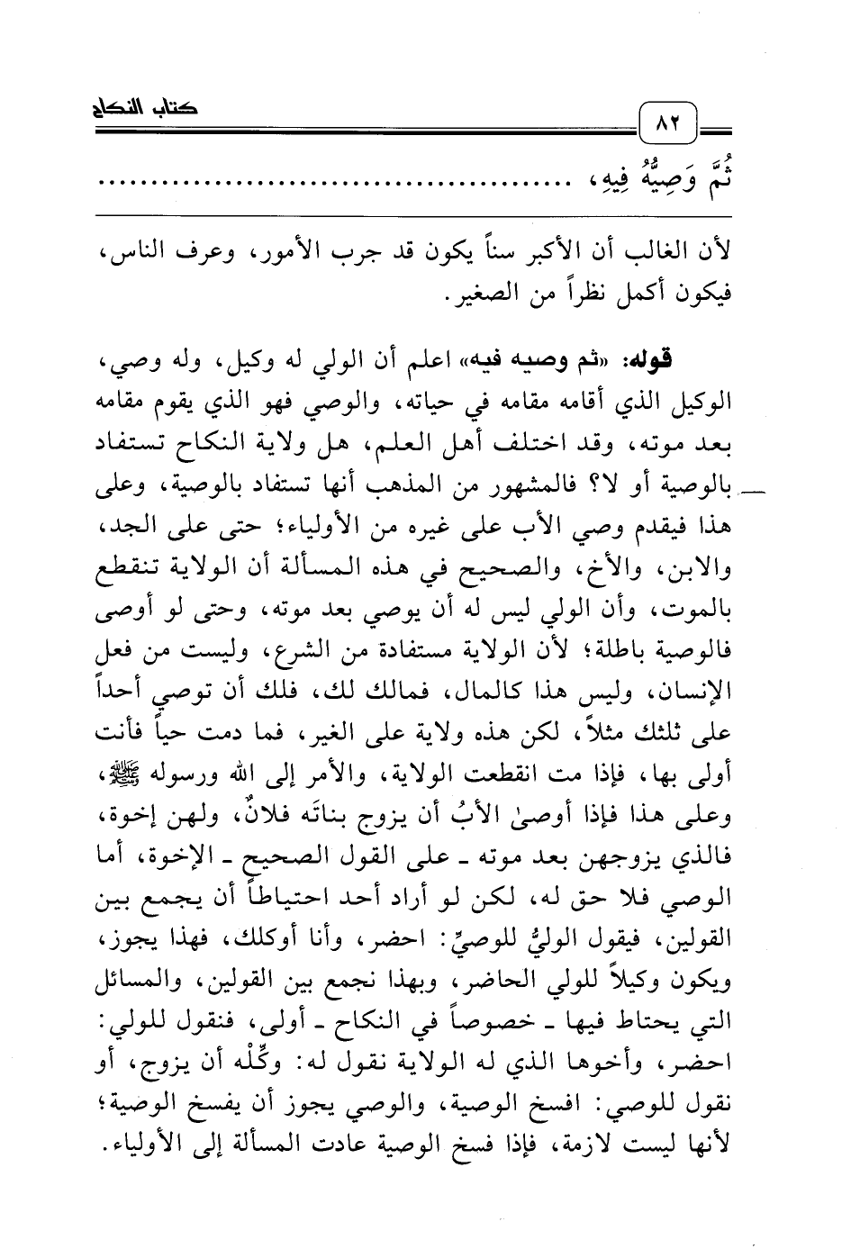قوله: «ثم وصيه فيه» اعلم أن الولي له وكيل، وله وصي، الوكيل الذي أقامه مقامه في حياته، والوصي فهو الذي يقوم مقامه بعد موته، وقد اختلف أهل العلم، هل ولاية النكاح تستفاد بالوصية أو لا؟ فالمشهور من المذهب أنها تستفاد بالوصية، وعلى هذا فيقدم وصي الأب على غيره من الأولياء؛ حتى على الجد، والابن، والأخ، والصحيح في هذه المسألة أن الولاية تنقطع بالموت، وأن الولي ليس له أن يوصي بعد موته، وحتى لو أوصى فالوصية باطلة؛ لأن الولاية مستفادة من الشرع، وليست من فعل الإنسان، وليس هذا كالمال، فمالك لك، فلك أن توصي أحداً على ثلثك مثلاً، لكن هذه ولاية على الغير، فما دمت حياً فأنت أولى بها، فإذا مت انقطعت الولاية، والأمر إلى الله ورسوله صلّى الله عليه وسلّم، وعلى هذا فإذا أوصى الأبُ أن يزوج بناتَه فلانٌ، ولهن إخوة، فالذي يزوجهن بعد موته ـ على القول الصحيح ـ الإخوة، أما الوصي فلا حق له، لكن لو أراد أحد احتياطاً أن يجمع بين القولين، فيقول الوليُّ للوصيِّ: احضر، وأنا أوكلك، فهذا يجوز، ويكون وكيلاً للولي الحاضر، وبهذا نجمع بين القولين، والمسائل التي يحتاط فيها ـ خصوصاً في النكاح ـ أولى، فنقول للولي: احضر، وأخوها الذي له الولاية نقول له: وكِّلْه أن يزوج، أو نقول للوصي: افسخ الوصية، والوصي يجوز أن يفسخ الوصية؛ لأنها ليست لازمة، فإذا فسخ الوصية عادت المسألة إلى الأولياء.