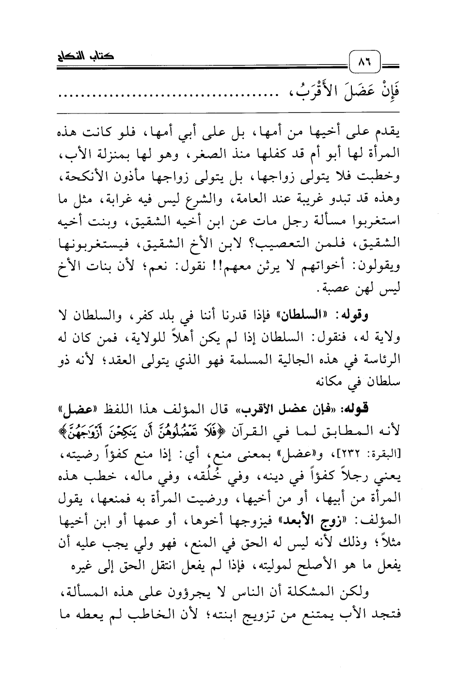 قوله: «فإن عضل الأقرب» قال المؤلف هذا اللفظ «عضل» لأنه المطابق لما في القرآن {فَلاَ تَعْضُلُوهُنَّ أَنْ يَنْكِحْنَ أَزْوَاجَهُنَّ} [البقرة: 232]، و «عضل» بمعنى منع، أي: إذا منع كفؤاً رضيته، يعني رجلاً كفؤاً في دينه، وفي خُلُقه، وفي ماله، خطب هذه المرأة من أبيها، أو من أخيها، ورضيت المرأة به فمنعها، يقول المؤلف: «زوج الأبعد» فيزوجها أخوها، أو عمها أو ابن أخيها مثلاً؛ وذلك لأنه ليس له الحق في المنع، فهو ولي يجب عليه أن يفعل ما هو الأصلح لموليته، فإذا لم يفعل انتقل الحق إلى غيره