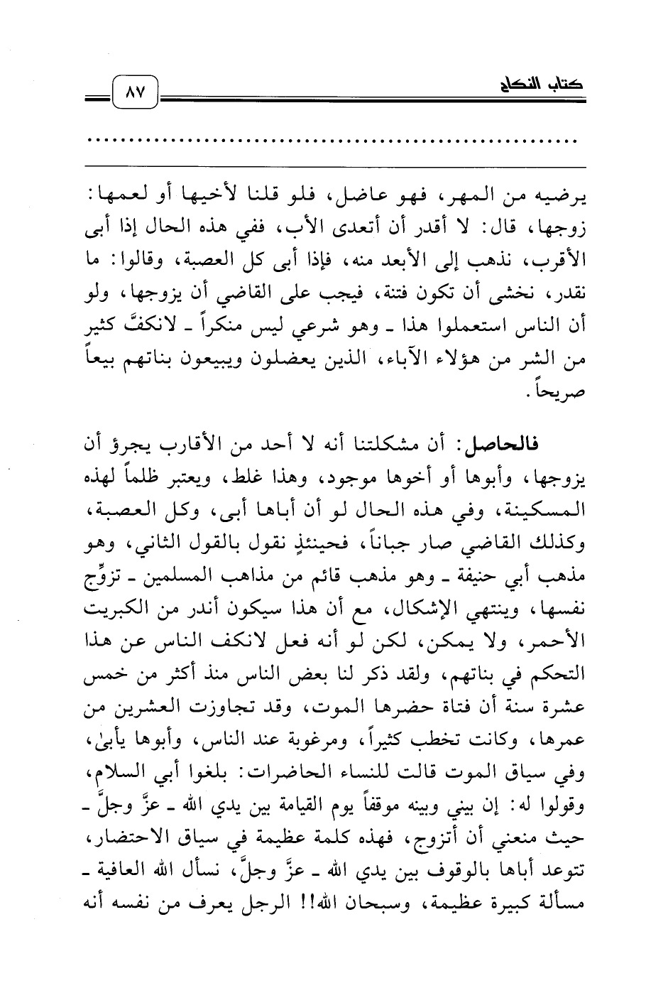 يرضيه من المهر، فهو عاضل، فلو قلنا لأخيها أو لعمها: زوجها، قال: لا أقدر أن أتعدى الأب، ففي هذه الحال إذا أبى الأقرب، نذهب إلى الأبعد منه، فإذا أبى كل العصبة، وقالوا: ما نقدر، نخشى أن تكون فتنة، فيجب على القاضي أن يزوجها، ولو أن الناس استعملوا هذا ـ وهو شرعي ليس منكراً ـ لانكفَّ كثير من الشر من هؤلاء الآباء، الذين يعضلون ويبيعون بناتهم بيعاً صريحاً.