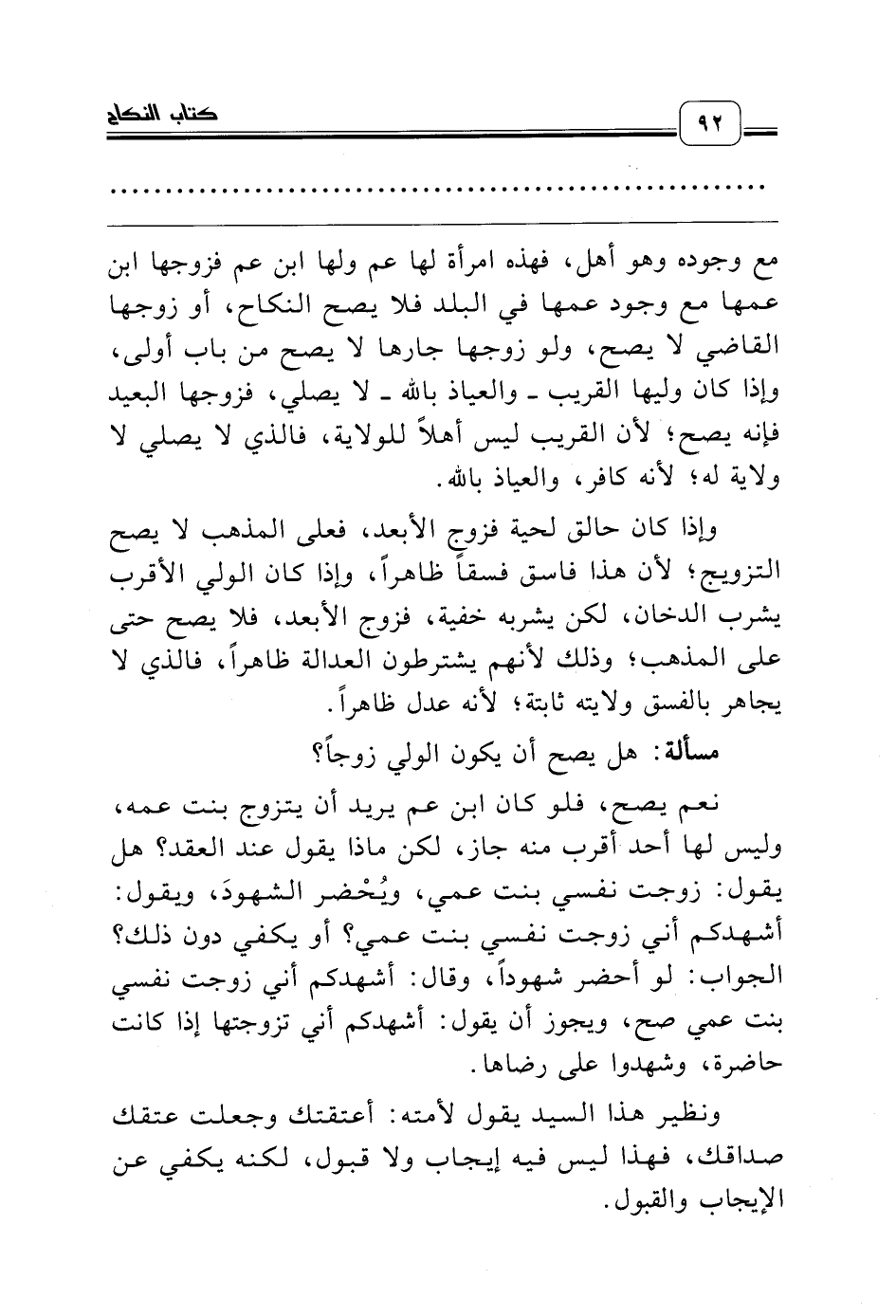 مع وجوده وهو أهل، فهذه امرأة لها عم ولها ابن عم فزوجها ابن عمها مع وجود عمها في البلد فلا يصح النكاح، أو زوجها القاضي لا يصح، ولو زوجها جارها لا يصح من باب أولى، وإذا كان وليها القريب ـ والعياذ بالله ـ لا يصلي، فزوجها البعيد فإنه يصح؛ لأن القريب ليس أهلاً للولاية، فالذي لا يصلي لا ولاية له؛ لأنه كافر، والعياذ بالله.