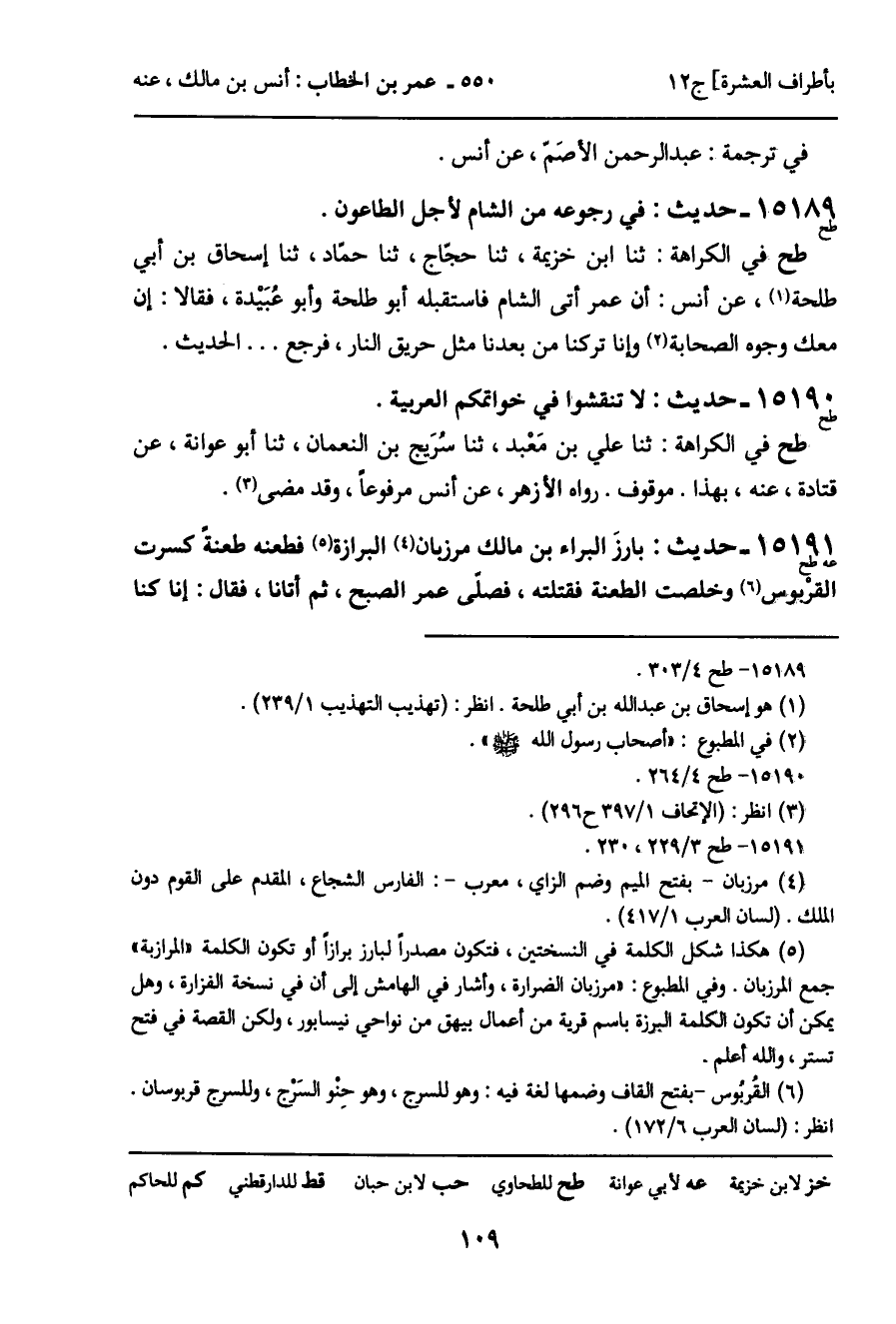 15191 - حديث (عه طح) : بارزَ البراء بن مالك مرزبان البرازة فطعنه طعنة كسرت القربوس وخلصت الطعنة فقتلته، فصلى عمر الصبح، ثم أتانا، فقال: إنا كنا