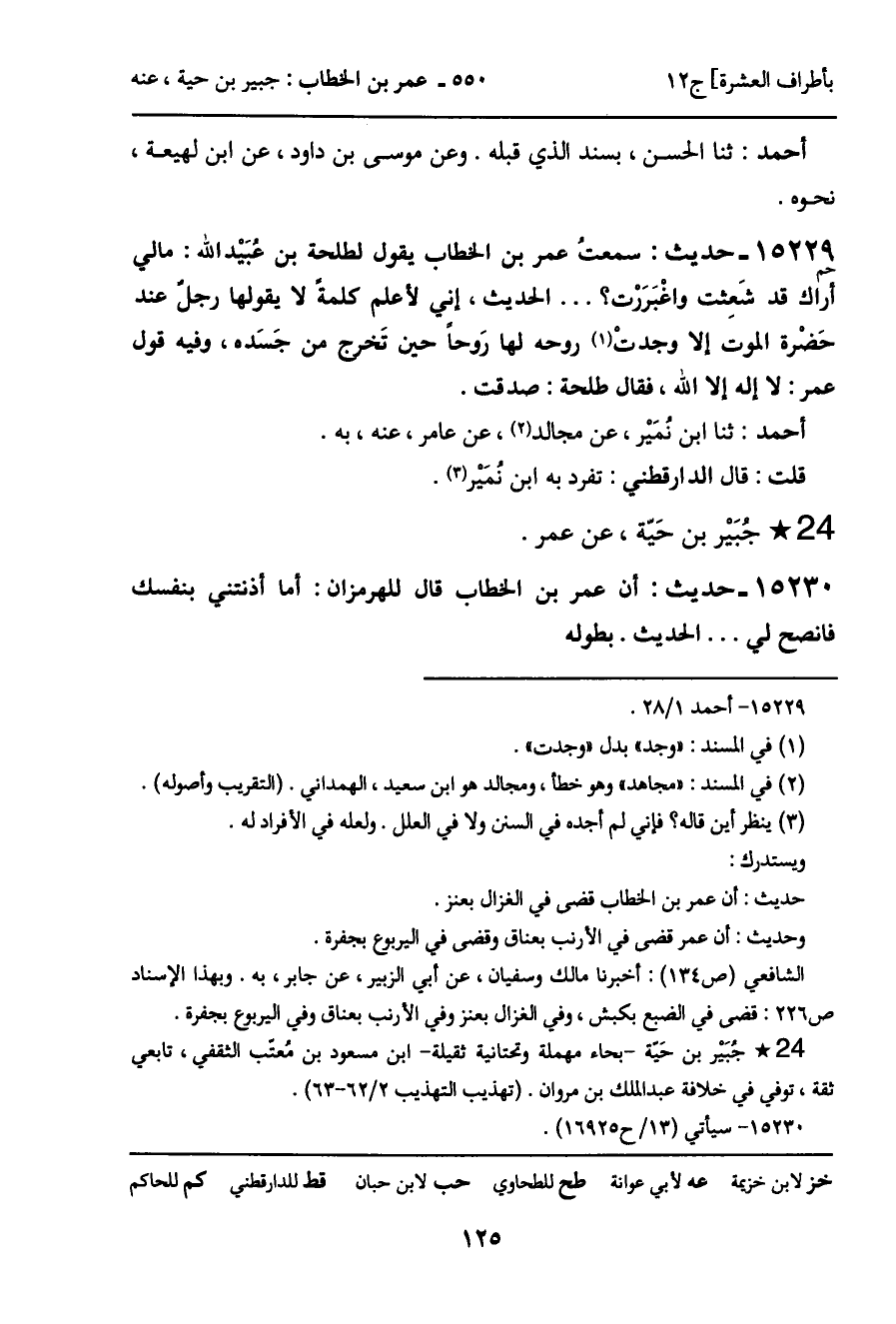 15229 - حديث (حم) : سمعتُ عمر بن الخطاب يقول لطلحة بن عبيد الله: مالي أراك قد شَعِثت واغْبَرَرْت؟ ... الحديث، إني لأعلم كلمةً لا يقولها رجل عند حَضْرة الموت إلا وجدتْ روحه لها رَوحاْ حين تخرج من جسَده، وفيه قول عمر: لا إله إلا الله، فقال طلحة: صدقت.