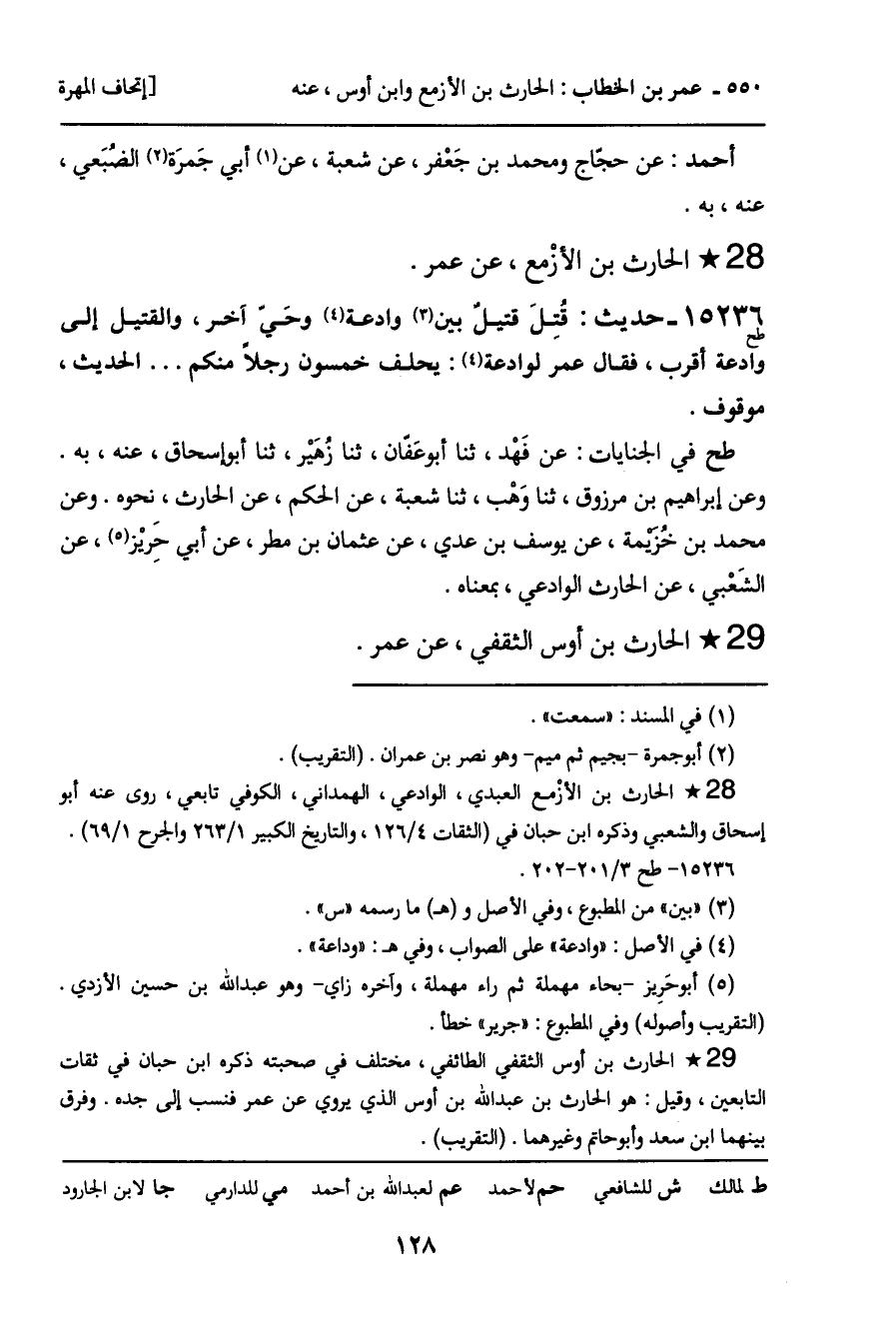 وعن إبراهيم بن مرزوق، ثنا وَهْب، ثنا شعبة، عن الحكم، عن الحارث، نحوه. وعن محمد بن خزيمة، عن يوسف بن عدي، عن عثمان بن مطر، عن أبي حِريْز، عن الشعْبي، عن الحارث الوادعي، بمعناه.