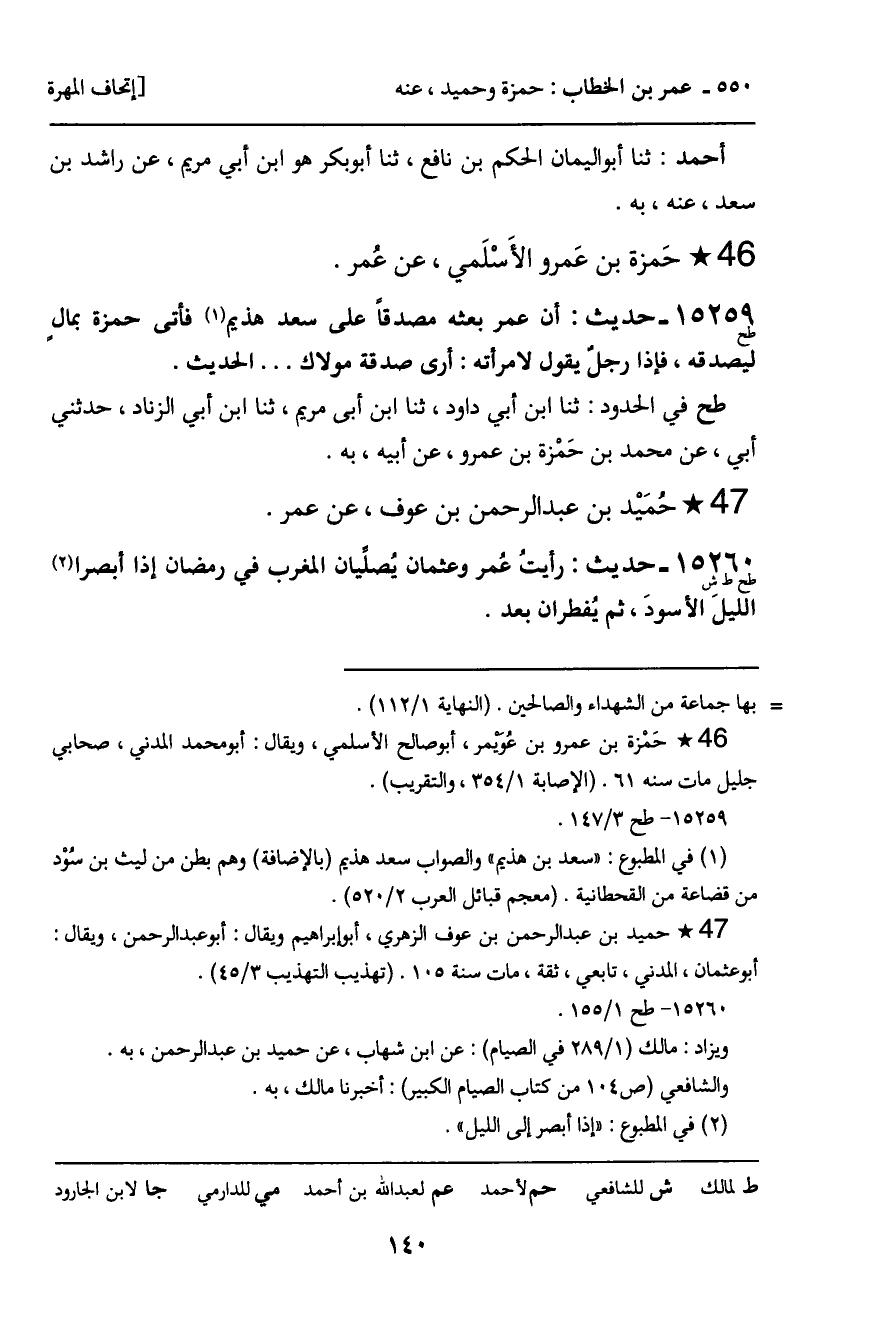 15259 - حديث (طح) : أن عمر بعثه مصدقاً على سعد هذيم فأتى حمزة بمال ليصدقه، فإذا رجل يقول لامرأته: أرى صدقة مولاك ... الحديث.