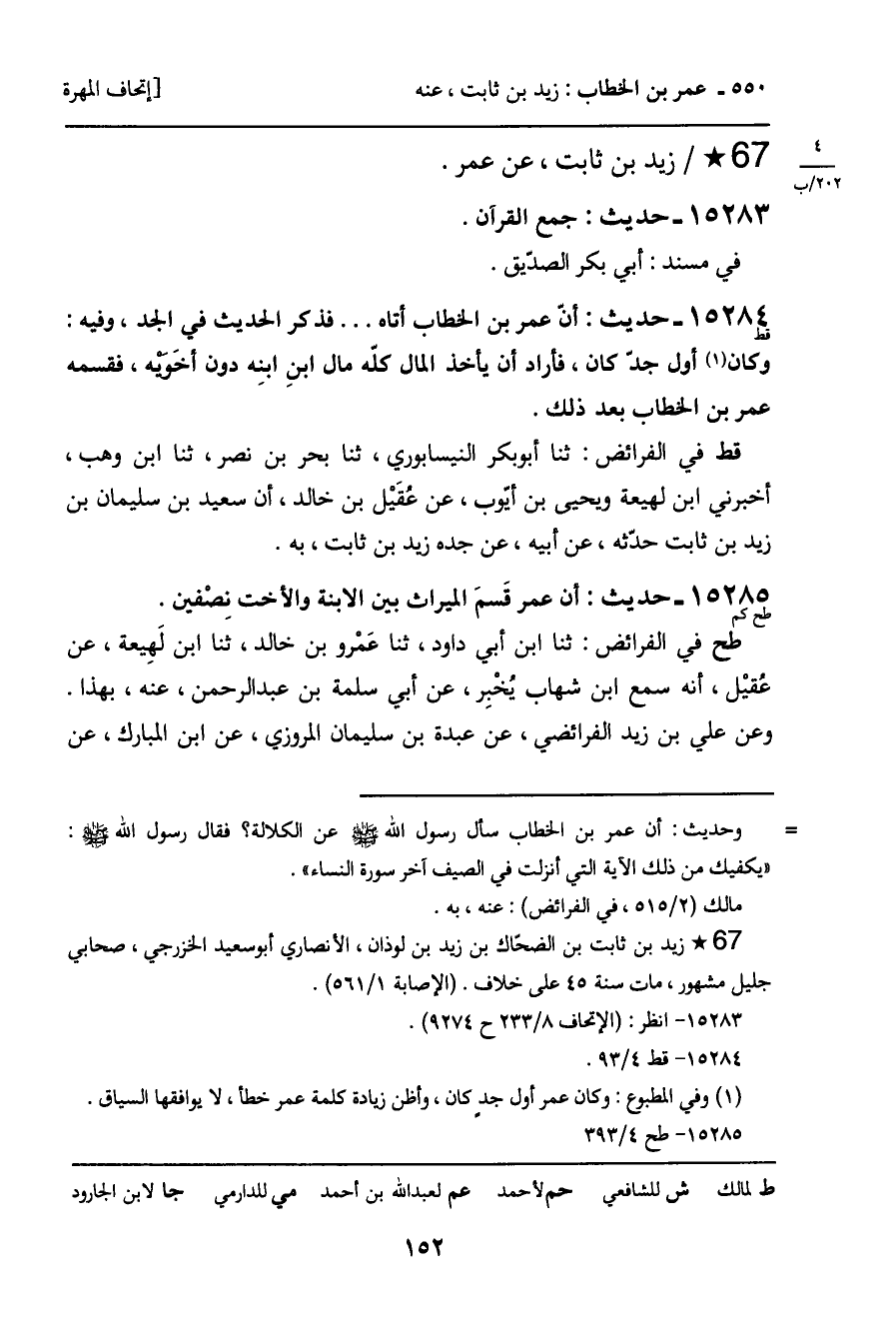 15285 - حديث (طح كم) : أن عمر قَسمَ الميراث بين الابنة والأخت نصْفين.