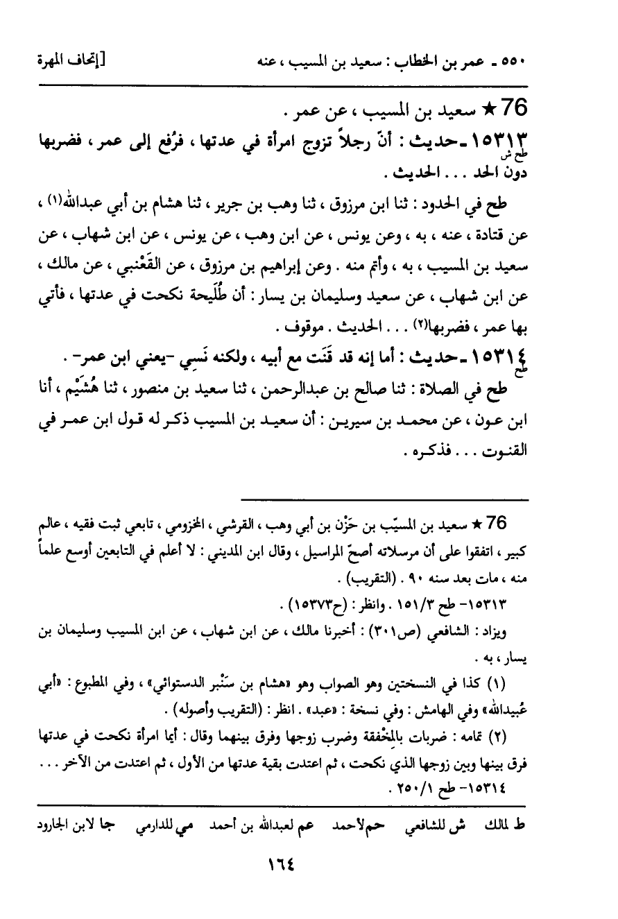 طح في الحدود: ثنا ابن مرزوق، ثنا وهب بن جرير، ثنا هشام بن أبي عبد الله، عن قتادة، عنه، به، وعن يونس، عن ابن وهب، عن يونس، عن ابن شهاب، عن سعيد بن المسيب، به، وأتم منه. عن إبراهيم بن مرزوق، عن القَعْنبي، عن مالك، عن ابن شهاب، عن سعيد وسليمان بن يسار: أن طُلَيحة نكحت في عدتها، فأتي بها عمر، فضربها ... الحديث. موقوف.