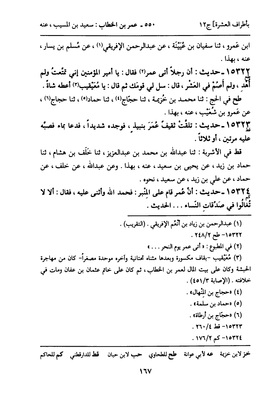 15322 - حديث (طح) : أن رجلاً أتى عمر فقال: يا أمير المؤمنين إني تمتَّعتُ ولم أهدِ، ولم أصُمْ في العشر، قال: سل لي قومك ثم قال: يا مُعيْقيب أعطه شاة.
