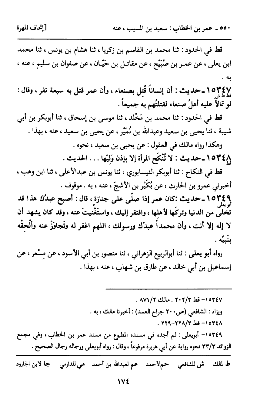 15347 - حديث (قط ط ش) : أن إنساناً قُتل بصنعاء، وأن عمر قتل له سبعة نفر، وقال لو تمالأ عليه أهل صنعاء لقتلتُهم به جميعاً.