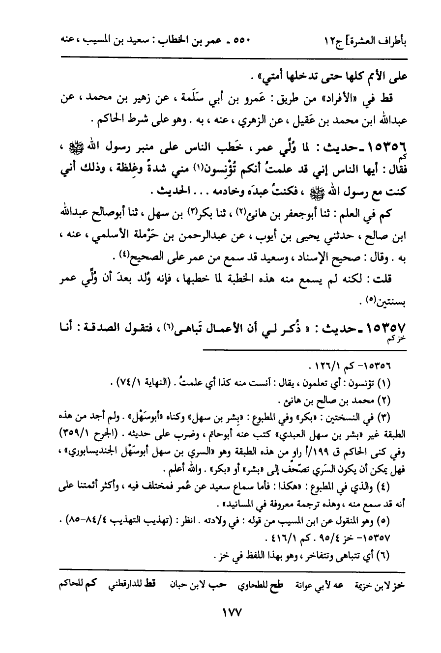 كم في العلم: ثنا أبو جعفر بن هانئ، ثنا بكر بن سهل، ثنا أبو صالح عبد الله ابن صالح، حدثني يحيى بن أيوب، عن عبد الرحمن بن حَرْملة الأسلمي، عنه، به. وقال: صحيح الإسناد، وسعيد قد سمع من عمر على الصحيح.
