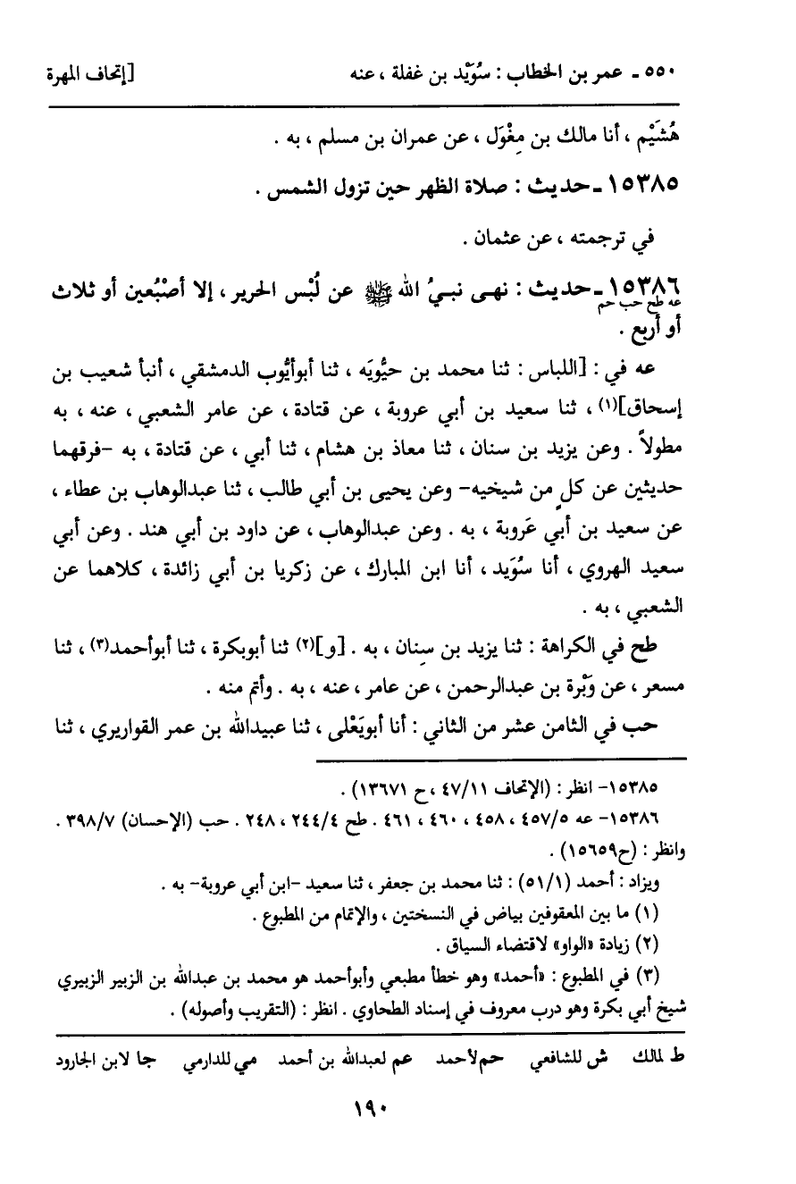 15386 - حديث (عه طح حب حم) : نهى نبيُ الله - صَلَّى اللَّهُ عَلَيْهِ وَسَلَّمَ - عن لُبْس الحرير، إلا إصْبُعين أو ثلاث أو أربع.