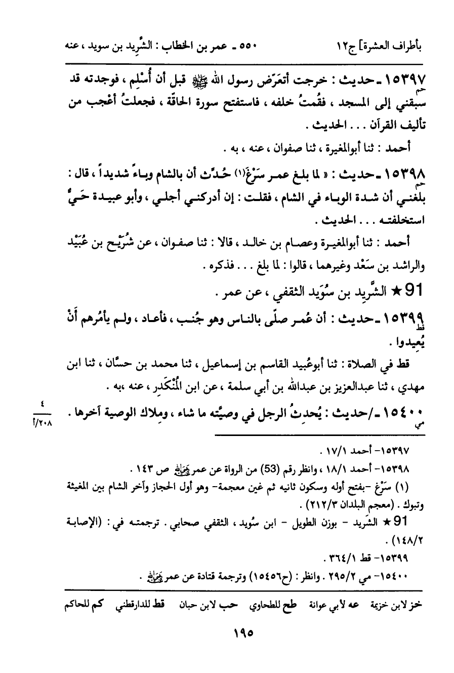 15397 - حديث (حم) : خرجت أتعَرّض رسول الله - صَلَّى اللَّهُ عَلَيْهِ وَسَلَّمَ - قبل أن أسْلِم، فوجدته قد سبقني إلى المسجد، فقمت خلفه، فاستفتح سورة الحاقة، فجعَلتُ أعجب من تأليف القرآن ... الحديث.