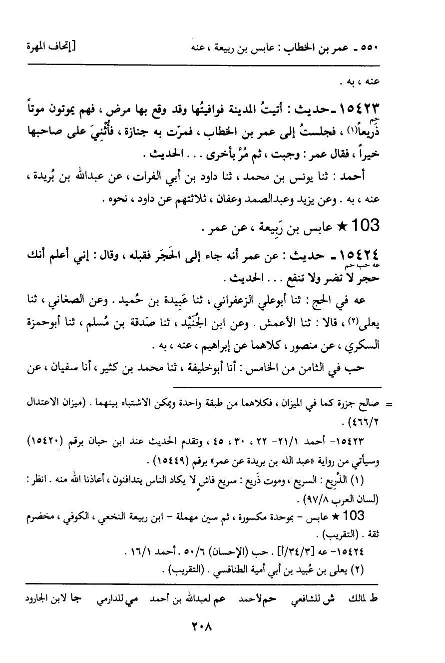 15424 - حديث (عه حب حم) : عن عمر أنه جاء إلى الحَجَر فقبله، وقال: إني أعلم أنك حجر لا تضر ولا تنفع ... الحديث.