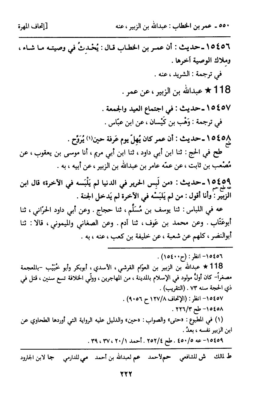 15459 - حديث (عه طح حم) : "من لبَس الحرير في الدنيا لم يَلْبسَه في الآخرة" قال ابن الزبير: وأنا أقول: من لم يَلبَسْه في الآخرة لم يَدخل الجنة.