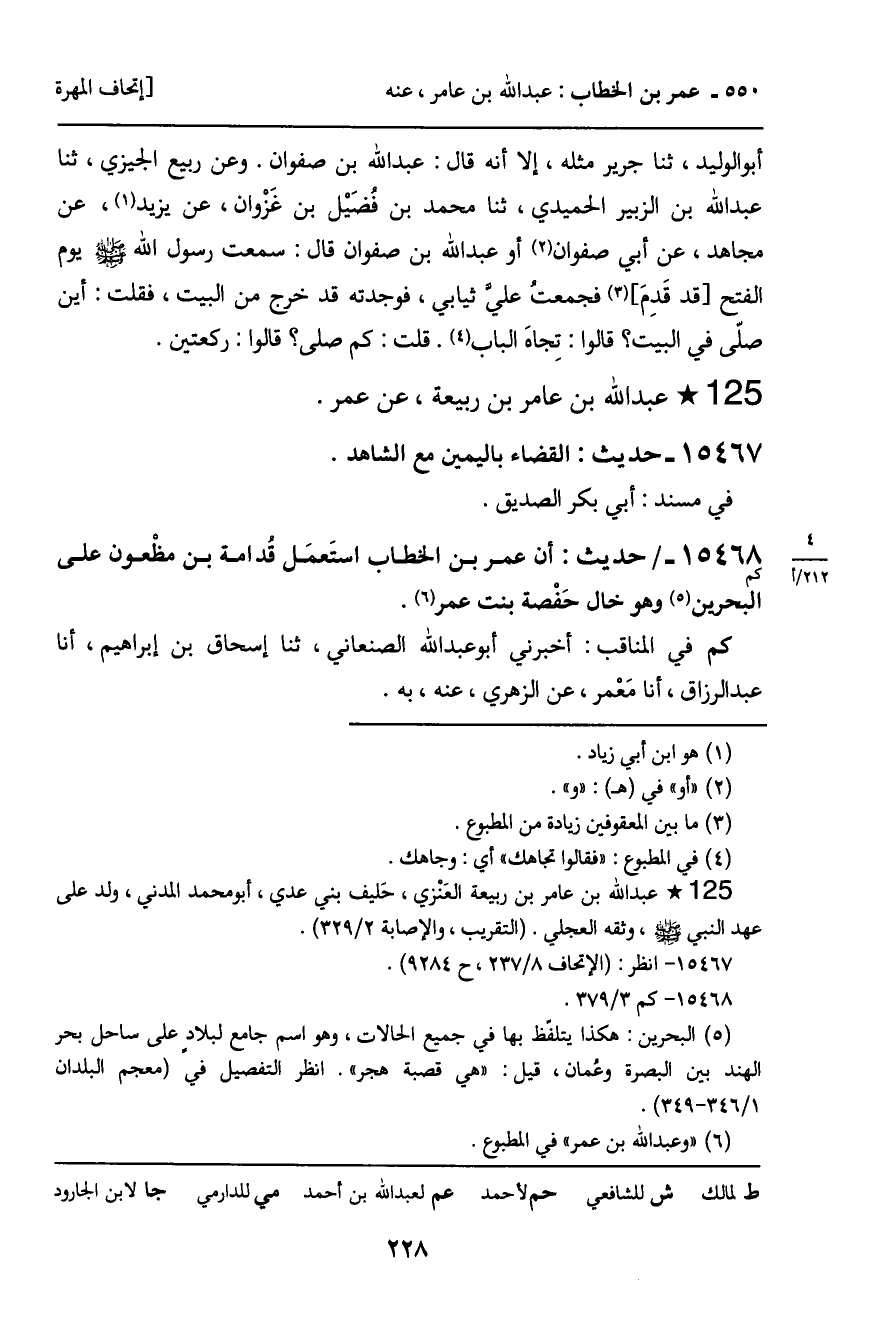15468 - حديث (كم) : أن عمر بن الخطاب استَعمَل قُدامة بن مظْعون على البحرين وهو خال حَفْصة بنت عمر.