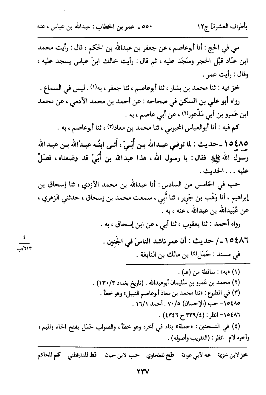 حب في الخامس من السادس: أنا عبد الله بن محمد الأزدي، ثنا إسحاق بن إبراهيم، أنا وَهْب بن جَرِير، ثنا أبي، سمعت محمد بن إسحاق، حدثني الزهري، عن عبَيد الله بن عبد الله، عنه، به.