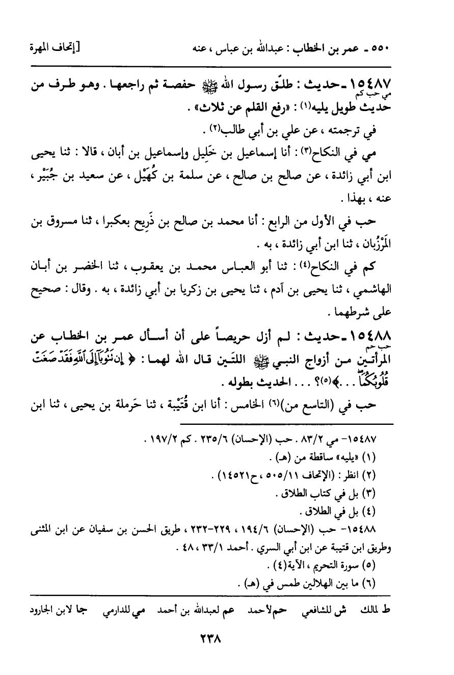 15487 - حديث (مي حب كم) : طلّق رسول الله - صَلَّى اللَّهُ عَلَيْهِ وَسَلَّمَ - حفصة ثم راجعها. وهو طرف من حديث طويل يليه: "رفع القلم عن ثلاث".