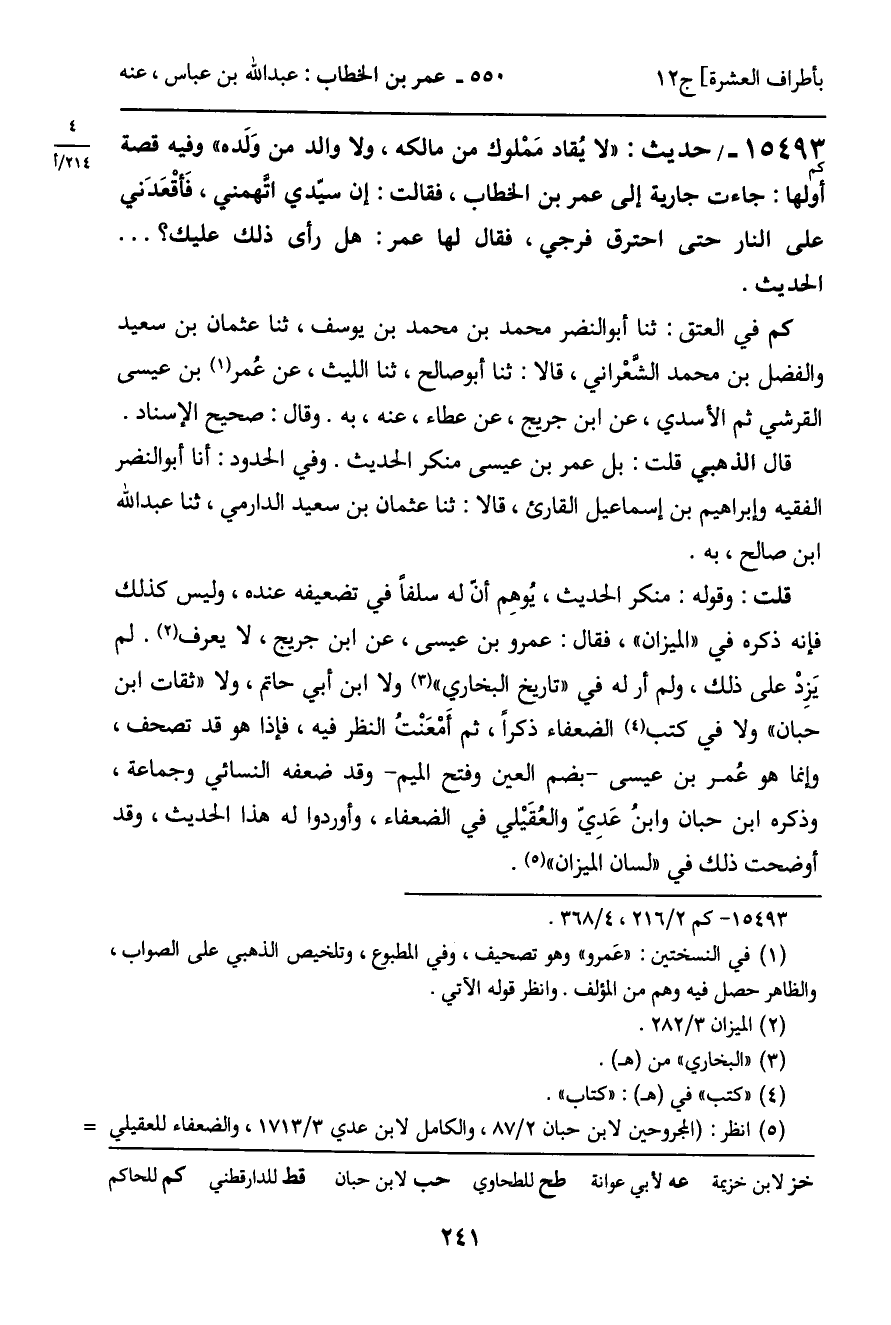 قال الذهبي قلت: بل عمر بن عيسى منكر الحديث. وفي الحدود: أنا أبو النضر الفقيه وإبراهيم بن إسماعيل القارئ، قالا: ثنا عثمان بن سعيد الدارمي، ثنا عبد الله ابن صالح، به.