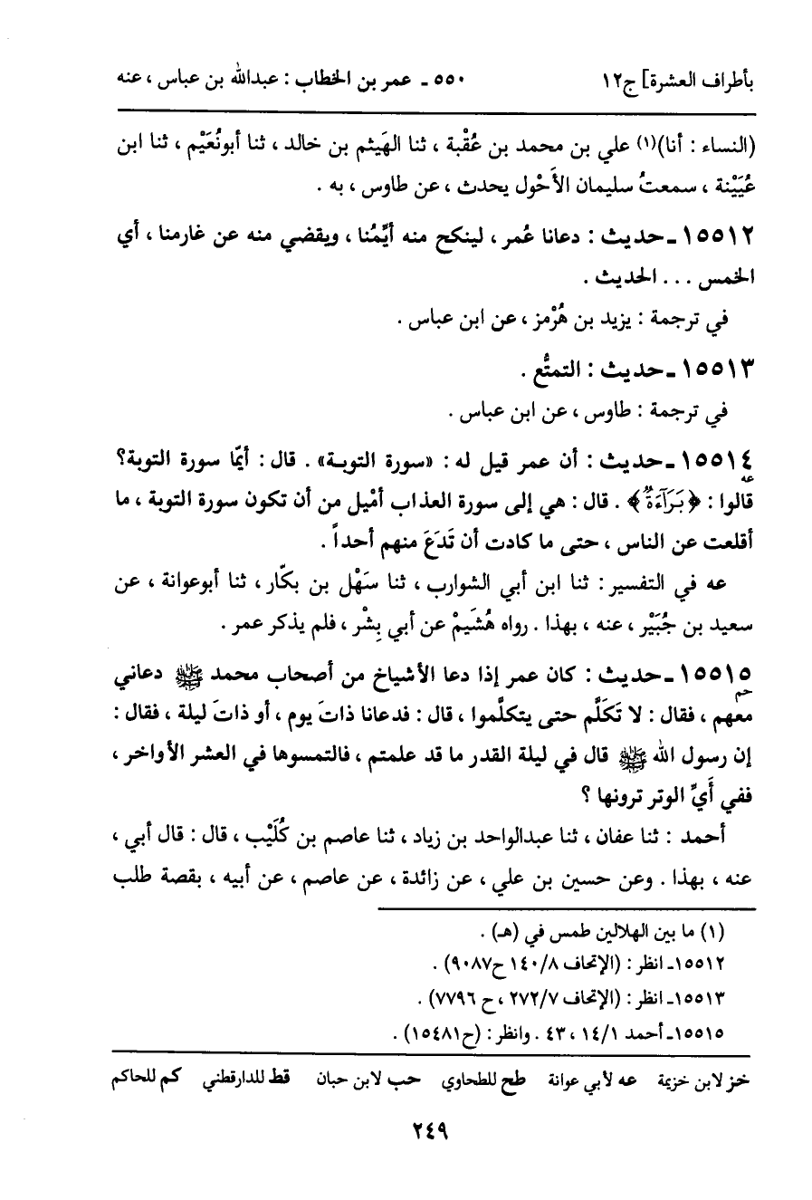15514 - حديث (عه) : أن عمر قيل له: "سورة التوبة". قال: أيمّا سورة التوبة؟ قالوا: (بَرَآءَةٌ) . قال: هي إلى سورة العذاب أمْيل من أن تكون سورة التوبة، ما أقلعت عن الناس، حتى ما كادت أن تَدع منهم أحداً.