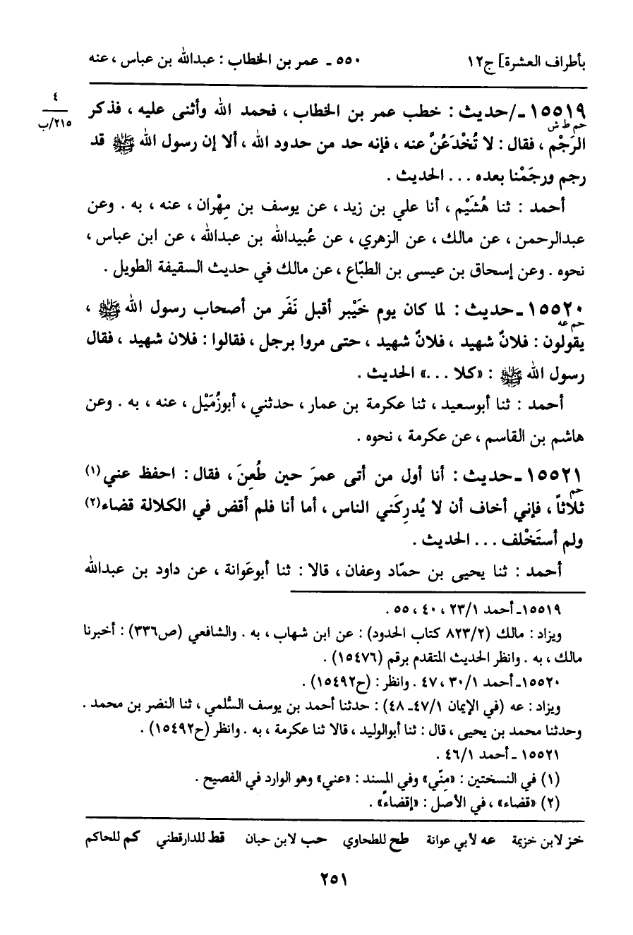 15519 - حديث (حم ط ش) : خطب عمر بن الخطاب، فحمد الله وأثنى عليه، فذكر الرَجْم، فقال: لا تُخْدَعُن عنه، فإنه حد من حدود الله، ألا إن رسول الله - صَلَّى اللَّهُ عَلَيْهِ وَسَلَّمَ - قد رجم ورجَمْنا بعده ... الحديث.