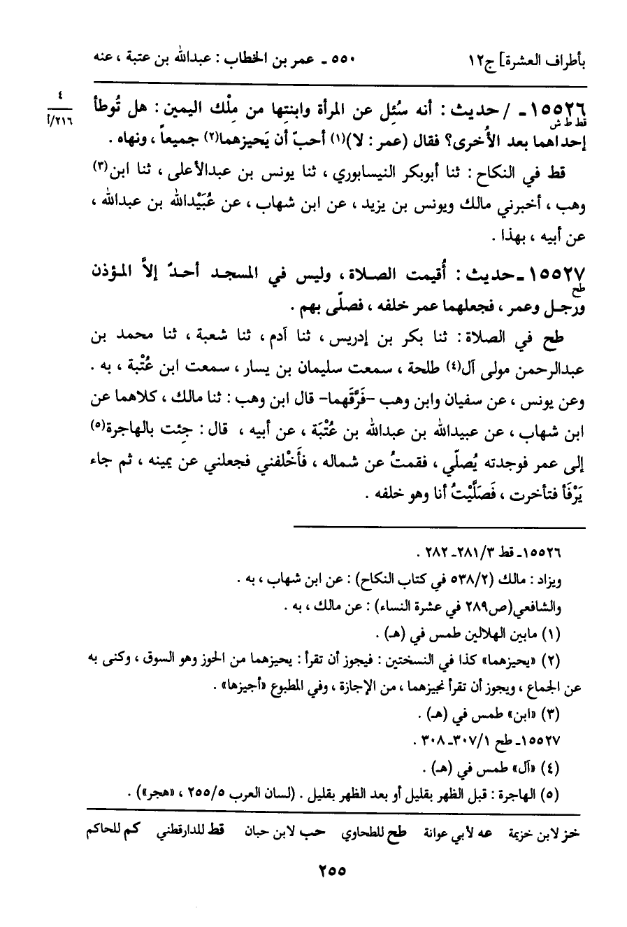15526 - حديث (قط ط ش) : أنه سئل عن المرأة وابنتها من ملْك اليمين: هل تُوطأ إحداهما بعد الأخرى؟ فقال (عمر: لا) أحب أن يَحيزهما جميعاً، ونهاه.