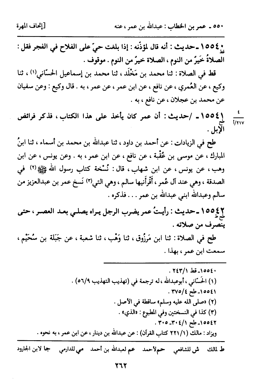 قط في الصلاة: ثنا محمد بن مَخْلَد، ثنا محمد بن إسماعيل الحسّاني، ثنا وكيع، عن العُمري، عن نافع، عن ابن عمر، عن عمر، به. قال وكيع: وعن سفيان عن محمد بن عجلان، عن نافع، به.