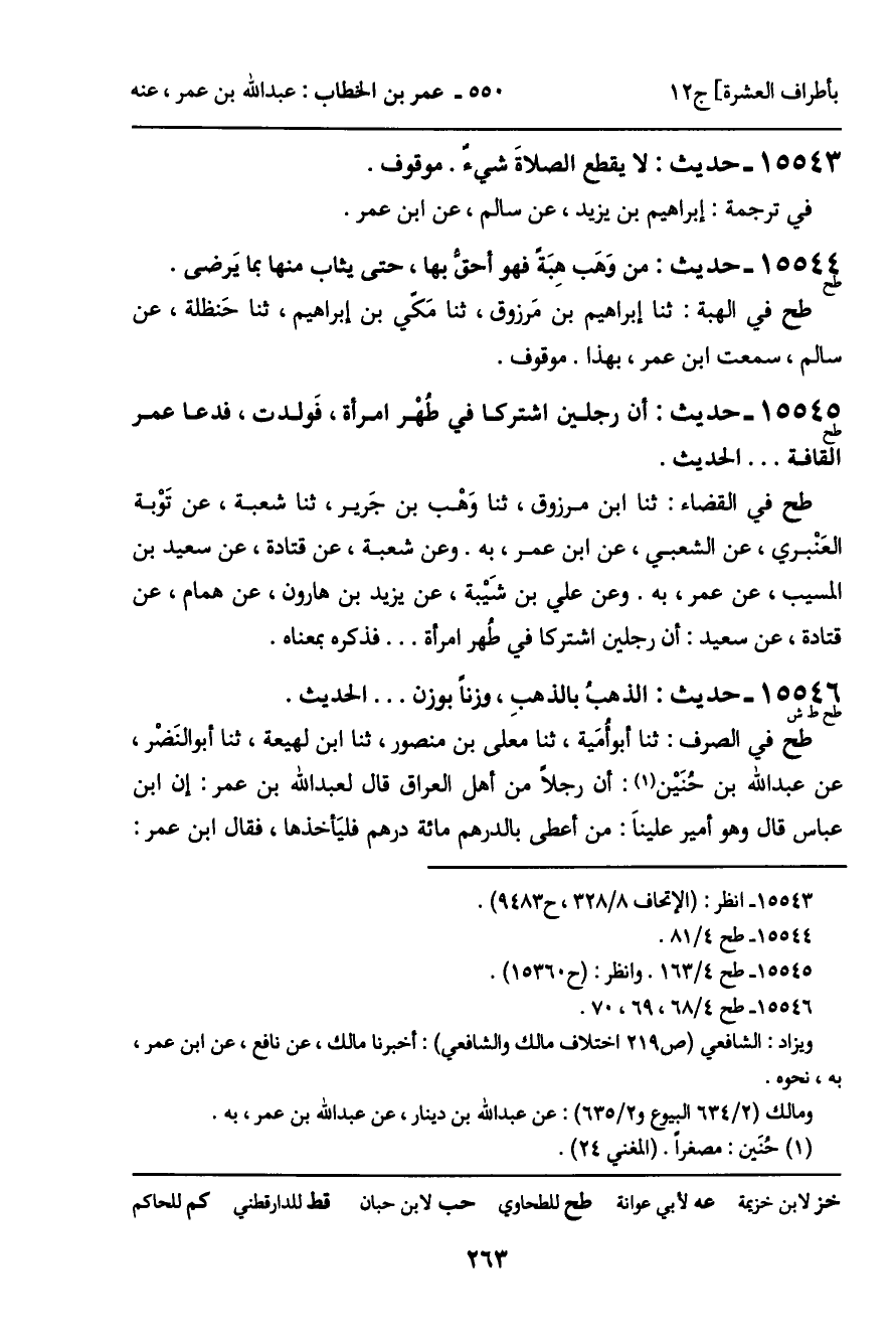 طح في الصرف: ثنا أبو أمَية، ثنا معلى بن منصور، ثنا ابن لهيعة، ثنا أبو النَضْر، عن عبد الله بن حُنَيْن: أن رجلاً من أهل العراق قال لعبد الله بن عمر: إن ابن عباس قال، هو أمير عليناَ: من أعطى بالدرهم مائة درهم فليَأخذها، فقال ابن عمر: