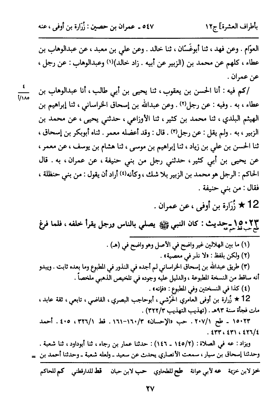 رواه أحمد: عن يحيى بن سعيد ومحمد بن جعفر، عن شعبة. وعن إسماعيل ابن إبراهيم، عن سعيد، كلاهما عن قتادة، بنحوه. وعن محبوب بن الحسن بن هلال بن أبي زينب، عن خالد، عن زُرارة، نحوه.