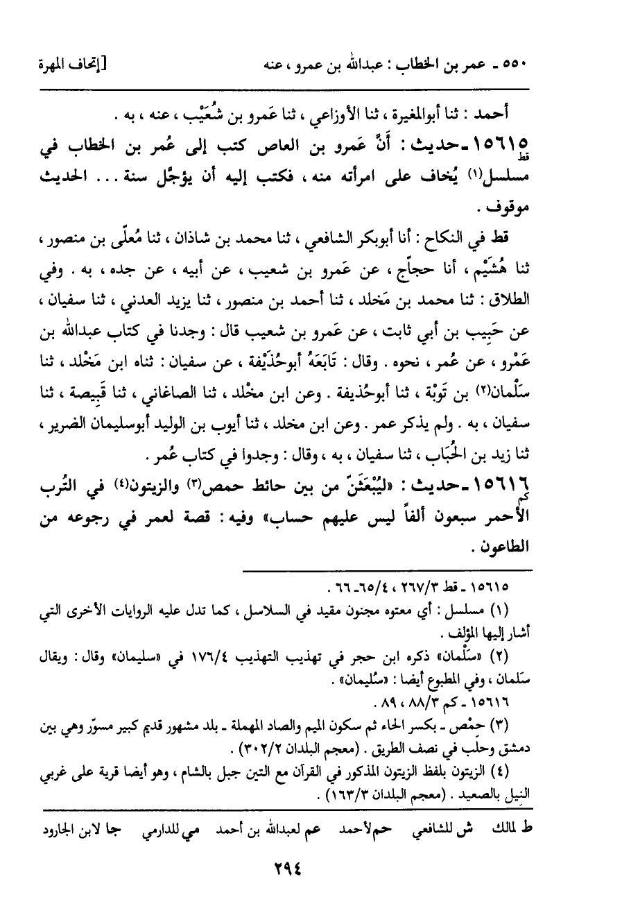 قط في النكاح: أنا أبو بكر الشافعي، ثنا محمد بن شاذان، ثنا مُعلّى بن منصور، ثنا هُشَيْم، أنا حجاّج، عن عَمرو بن شعيب، عن أبيه، عن جده، به. وفي الطلاق: ثنا محمد بن مَخلد، ثنا أحمد بن منصور، ثنا يزيد العدني، ثنا سفيان، عن حَبِيب بن أبي ثابت، عن عَمرو بن شعيب قال: وجدنا في كتاب عبد الله بن عَمْرو، عن عُمر، نحوه. وقال: تَابَعهُ أبو حُذَيْفة، عن سفيان: ثناه ابن مَخْلد، ثنا سَلْمان بن تَوبْة، ثنا أبو حُذيفة. وعن ابن مخْلد، ثنا الصاغاني، ثنا قَبِيصة، ثنا سفيان، به. ولم يذكر عمر. وعن ابن مخلد، ثنا أيوب بن الوليد أبو سليمان الضرير، ثنا زيد بن الحُبَاب، ثنا سفيان، به، وقال: وجدوا في كتاب عُمر.