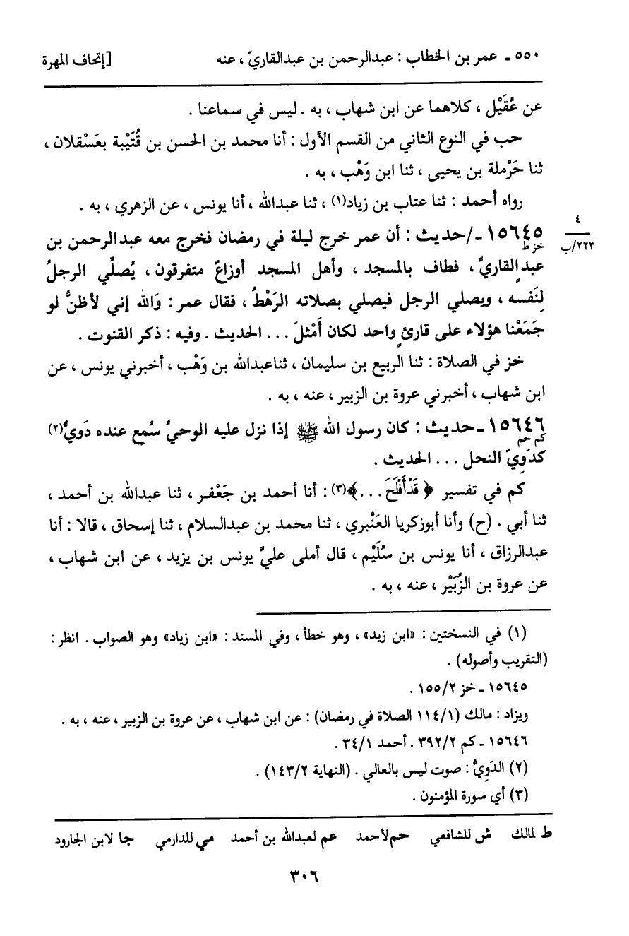 كم في تفسير (قَدْ أَفلَحَ ... ) : أنا أحمد بن جَعْفر، ثنا عبد الله بن أحمد، ثنا أبي. (ح) وأنا أبو زكريا العَنْبري، ثنا محمد بن عبد السلام، ثنا إسحاق، قالا: أنا عبد الرزاق، أنا يونس بن سُلَيْم، قال أملى عليَّ يونس بن يزيد، عن ابن شهاب، عن عروة بن الزبيْر، عنه، به.