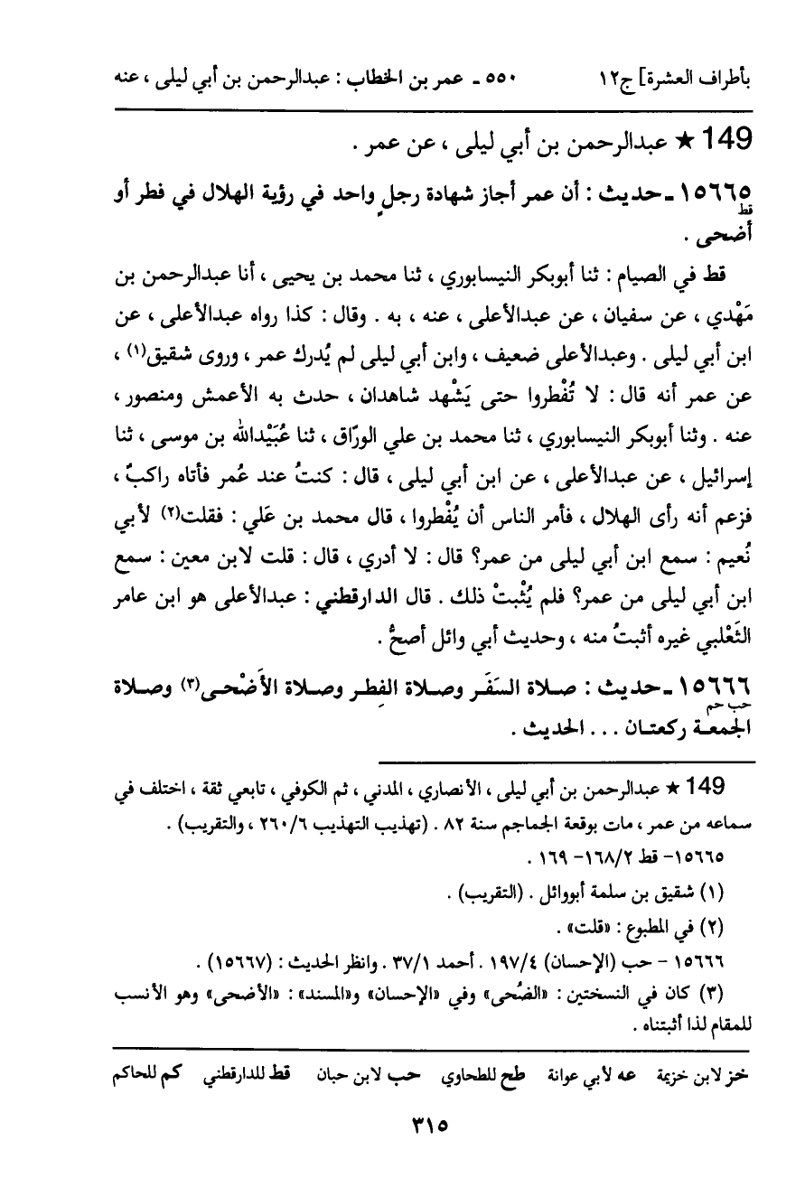 قط في الصيام: ثنا أبو بكر النيسابوري، ثنا محمد بن يحيى، أنا عبد الرحمن بن مَهْدي، عن سفيان، عن عبد الأعلى، عنه، به. وقال: كذا رواه عبد الأعلى، عن ابن أبي ليلى. وعبد الأعلى ضعيف، وابن أبي ليلى لم يُدرك عمر، وروى شقيق، عن عمر أنه قال: لا تفْطروا حتى يَشهد شاهدان، حدث به الأعمش ومنصور، عنه. وثنا أبو بكر النيسابوري، ثنا محمد بن علي الوراق، ثنا عبيد الله بن موسى، ثنا إسرائيل، عن عبد الأعلى، عن ابن أبي ليلى، قال: كنتُ عند عُمر فأتاه راكب، فزعم أنه رأى الهلال، فأمر الناس أن يُفْطروا، قال محمد بن عَلي: فقلت لأبي نُعيم: سمع ابن أبي ليلى من عمر؟ قال: لا أدري، قال: قلت لابن معين: سمع ابن أبي ليلى من عمر؟ فلم يُثْبتْ ذلك. قال الدارقطني: عبد الأعلى هو ابن عامر الثَعْلبي غيره أثبت منه، وحديث أبي وائل أصح.