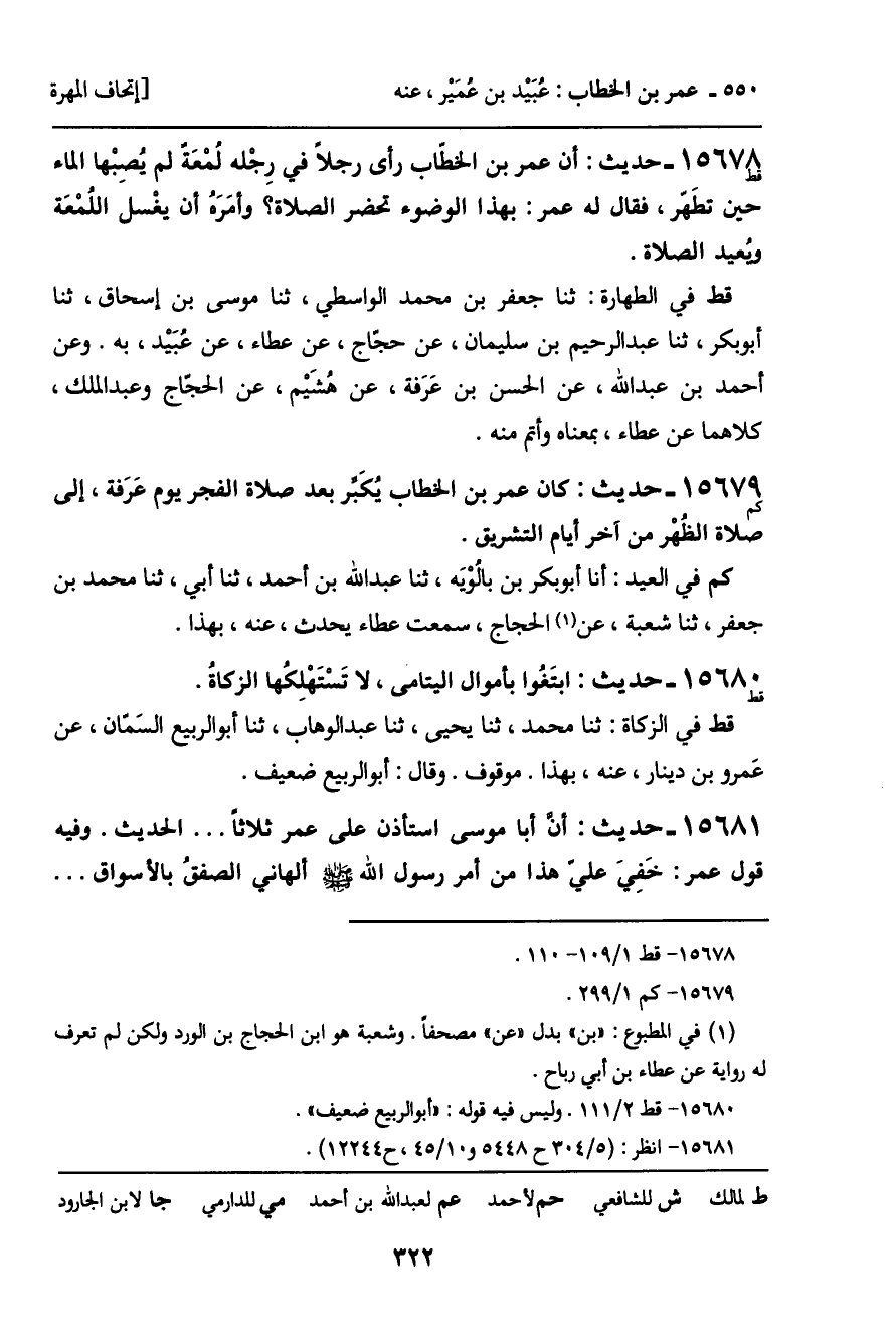 15678 - حديث (قط) : أن عمر بن الخطاب رأى رجلاً في رِجْله لُمْعَةً لم يصبْها الماء حين تطَهر، فقال له عمر: بهذا الوضوء تحضر الصلاة؟ وأمَرهُ أن يغْسلَ اللُمعَة ويُعيد الصلاة.