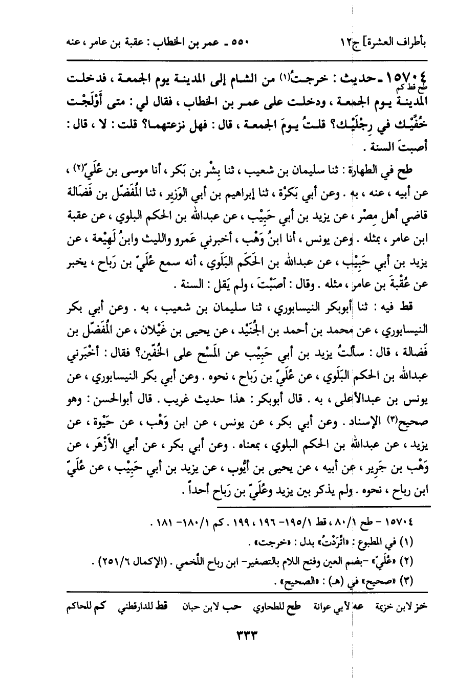 طح في الطهارة: ثنا سليمان بن شعيب، ثنا بشْر بن بَكر، أنا موسى بن عُلَيّ، عن أبيه، عنه، به. وعن أبي بَكرْة، ثنا إبراهيم بن أبي الوَزير، ثنا المفَضل بن فَضَالة قاضي أهل مِصْر، عن يزيد بن أبي حَبيْب، عن عبد الله بن الحكم البلوي، عن عقبة ابن عامر، بمثله. وعن يونس، أنا ابن وَهْب، أخبرني عَمرو والليث وابنُ لَهِيْعة، عن يزيد بن أبي حَبِيْب، عن عبد الله بن الحَكَم البَلَوي، أنه سمع عُلَيّ بن رَباح، يخبر عن عُقْبةَ بن عامر، مثله. وقال: أصبت، ولم يقل: السنة.