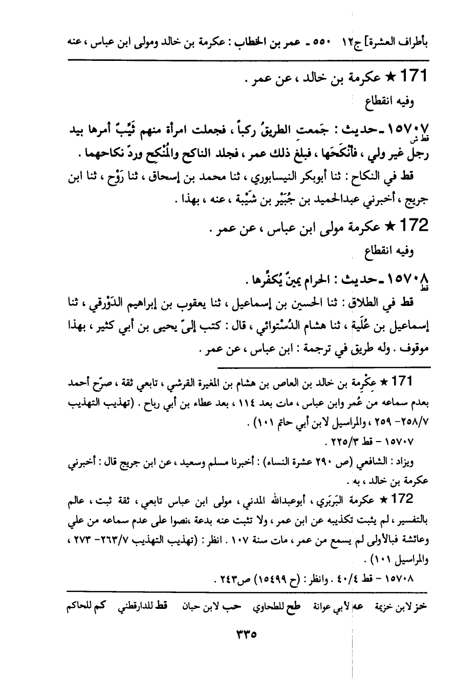 قط في الطلاق: ثنا الحسين بن إسماعيل، ثنا يعقوب بن إبراهيم الدَوْرقي، ثنا إسماعيل بن عُلَية، ثنا هشام الدُسْتوائي، قال: كتب إلى يحيى بن أبي كثير، بهذا موقوف. وله طريق في ترجمة: ابن عباس، عن عمر.
