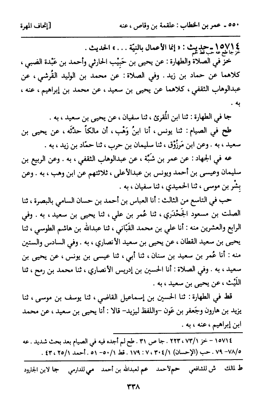 15714 - حديث (خز جا طح عه حب قط حم) : "إنما الأعمال بالنيّة ... " الحديث.