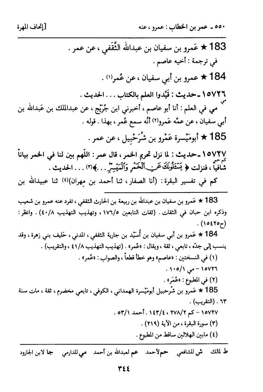 مي في العلم: أنا أبو عاصم، أخبرني ابن جُريج، عن عبد الملك بن عبد الله بن أبي سفيان، عن عمِّه عَمرو أنَّه سمع عُمر، بهذا. قوله.