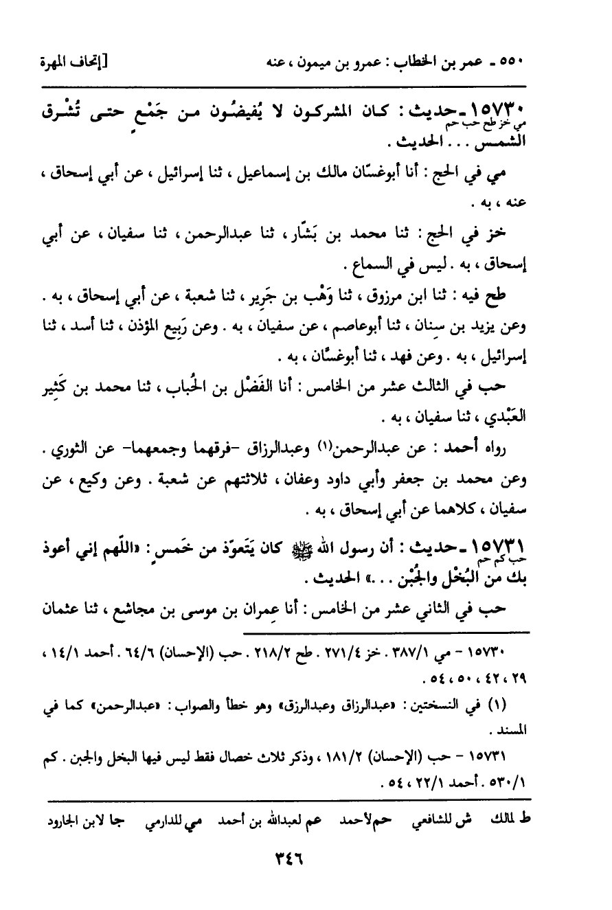 15730 - حديث (مي خز طح حب حم) : كان المشركون لا يُفيضُون من جَمْع حتى تُشرق الشمس ... الحديث.