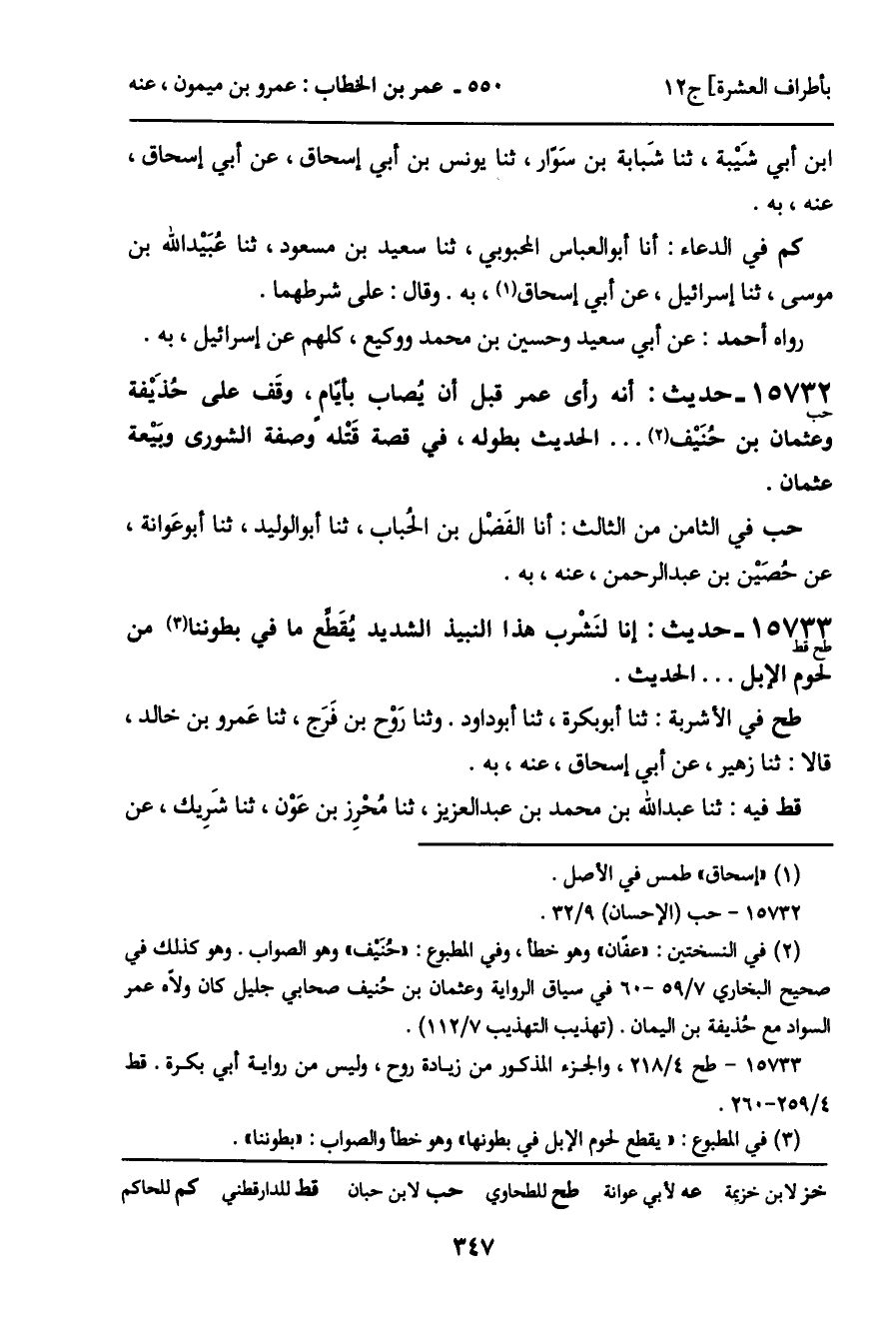15732 - حديث (حب) : أنه رأى عمر قبل أن يُصاب بأيام، وقَف على حُذَيْفة وعثمان بن حُنَيْف ... الحديث بطوله، في قصة قتله وصفة الشورى وبَيْعة عثمان.