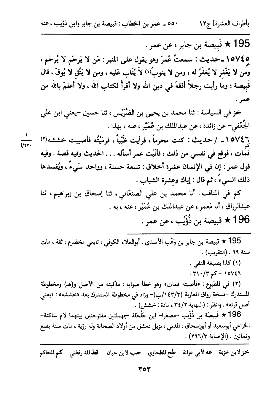 15745 - حديث (خز) : سمعتُ عُمرَ وهو يقول على المنبر: من لا يَرحَم لا يُرحَم، ومن لا يَغْفِر لا يُغفَرُ له، ومن لا يتوبُ لاَ يتَاب عَليه، ومن لا يتق لا يُوقَ، قال قَبِيصة؛ وما رأيت رجلاً أفقهَ في دين الله ولا أقرأ لكتاب الله، ولا أعلمَ بالله من عمر.